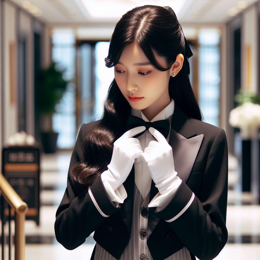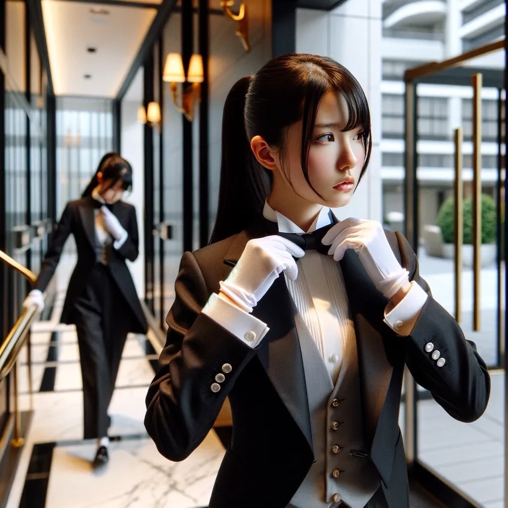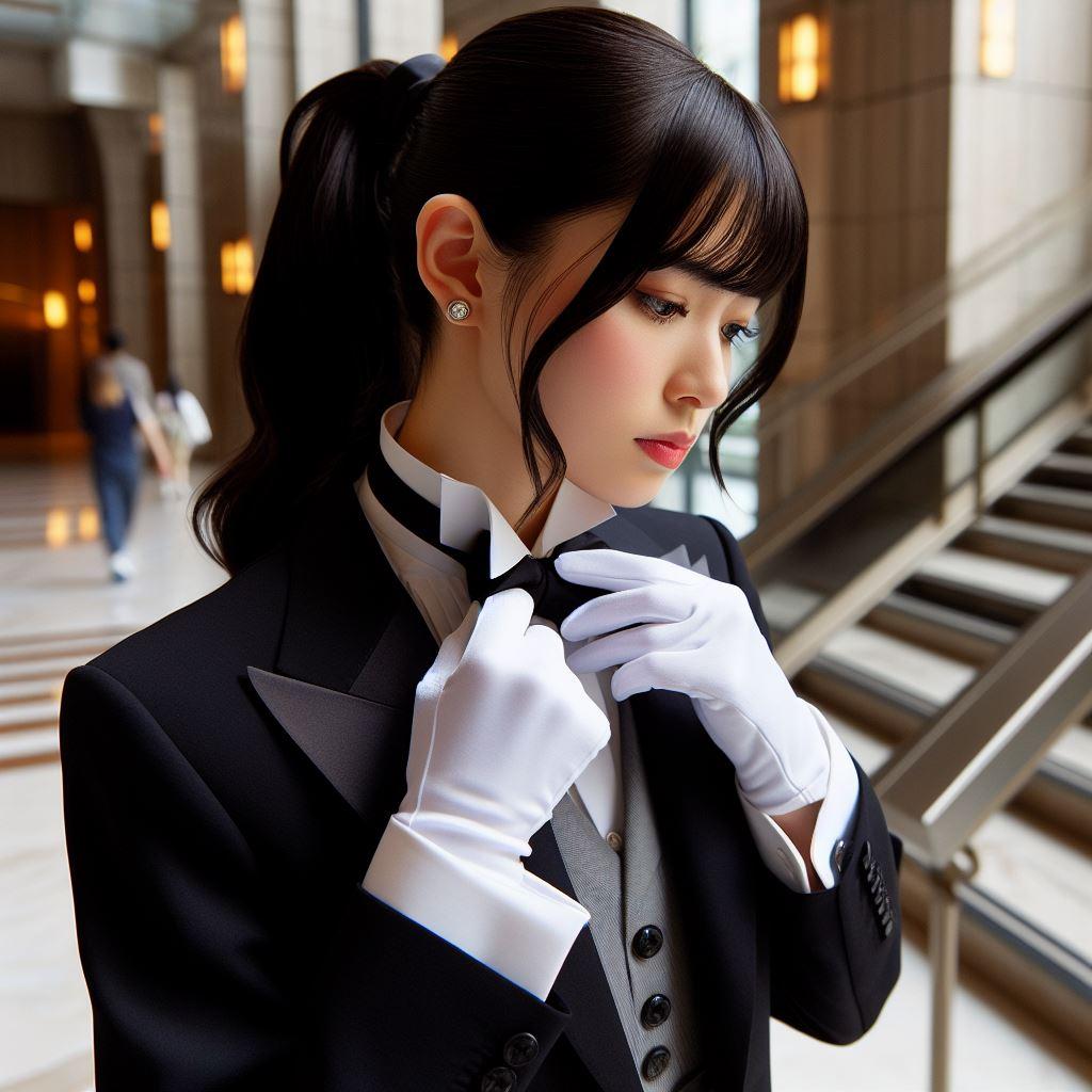 執事ちゃん{25歳、日本人女優、黒いポニーテール髪、タキシード、礼装用の白手袋、男装の麗人}がネクタイを締め直しながら、近代的なビルのエントランスホールを足早に通り過ぎていく