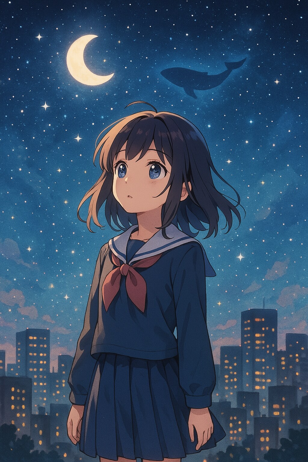 場所は都心の喧騒を少し離れた高台のビル屋上。目の前には高層ビル群の夜景が広がり、見上げれば満天の星。そして、その夜空を泳ぐように浮かぶ小さな月とクジラのシルエット。まるで絵本の世界に迷い込んだかのような、メルヘンチックな風景が広がります。
