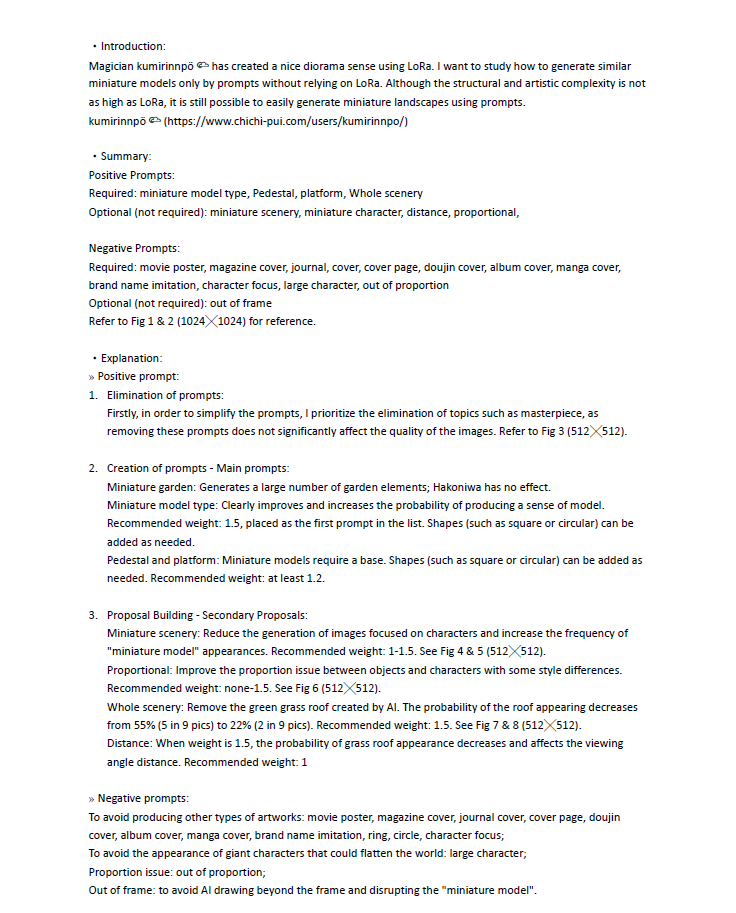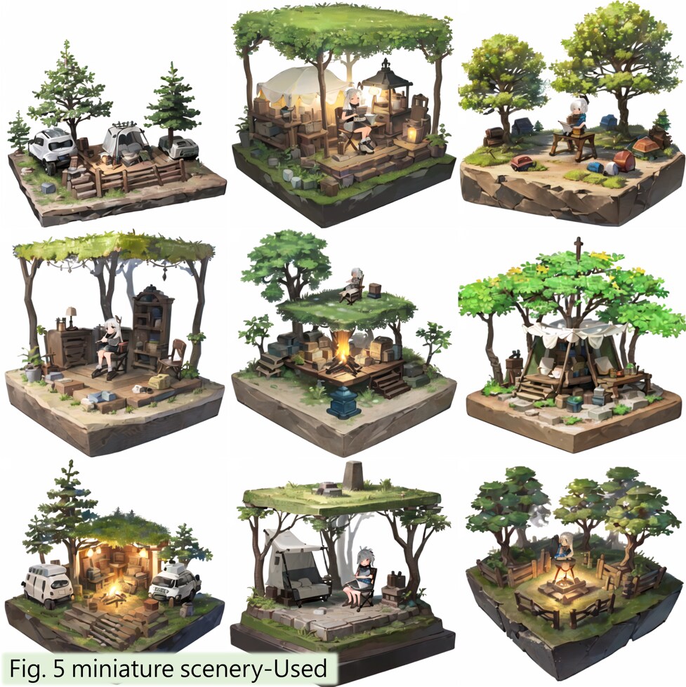 miniature scenery: 人物を焦点にした画像を減らし、「ミニチュアモデル」の出現頻度を増やします。推奨重み:1〜1.5。Fig. 4&5を参照してください(512╳512)。