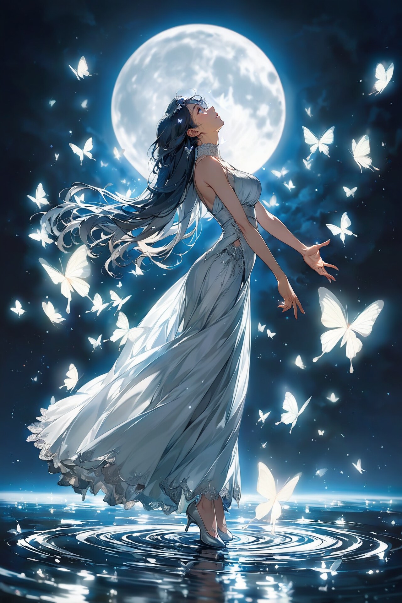 月夜に蝶と舞うおねいさんです。