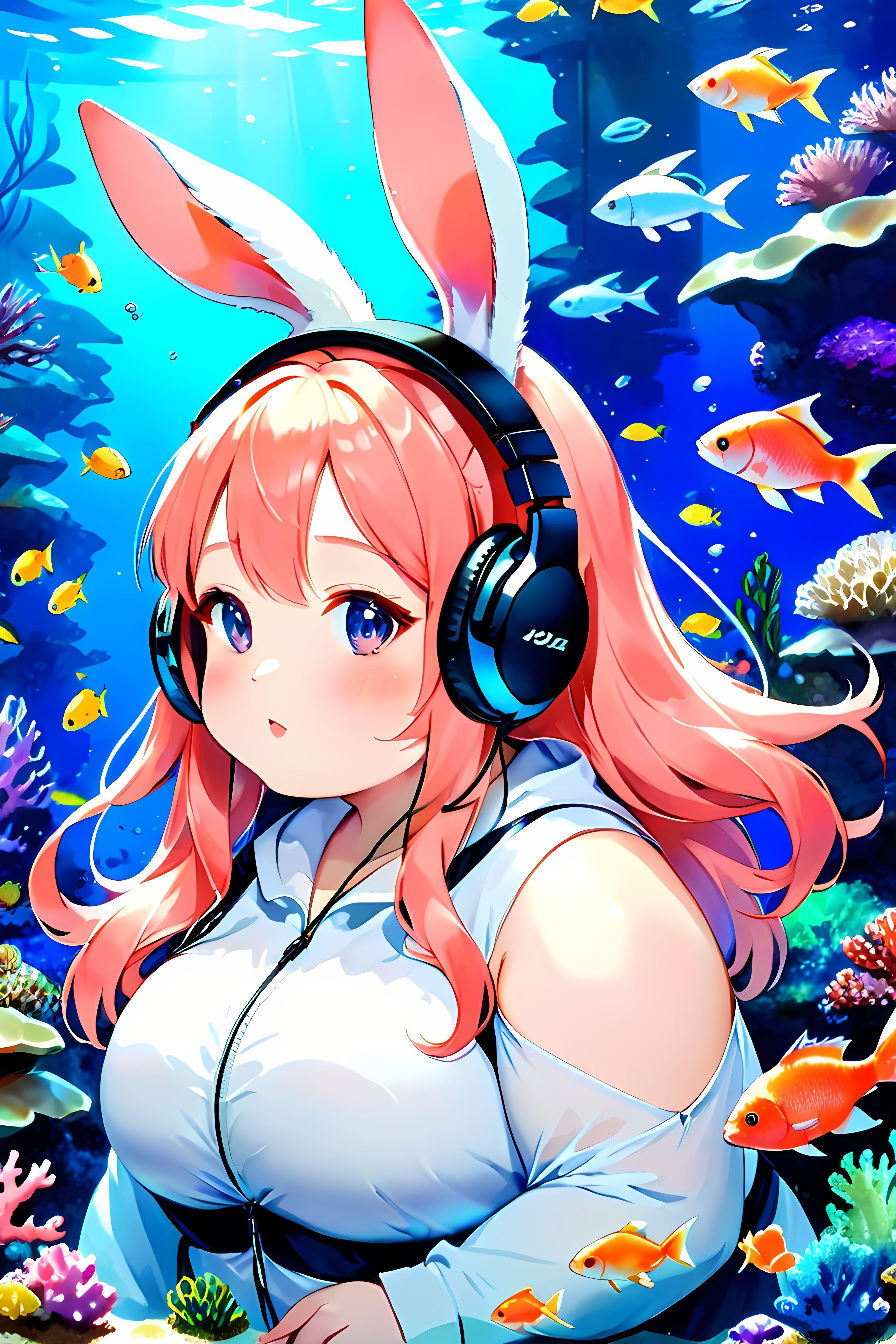 ウサギ×ヘッドフォン×魚×海×ぽっちゃり女子=ぽっちゃり系AIイラスト
