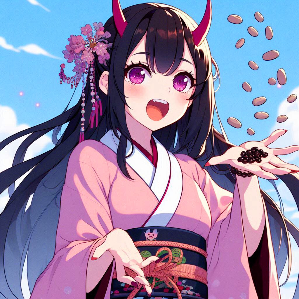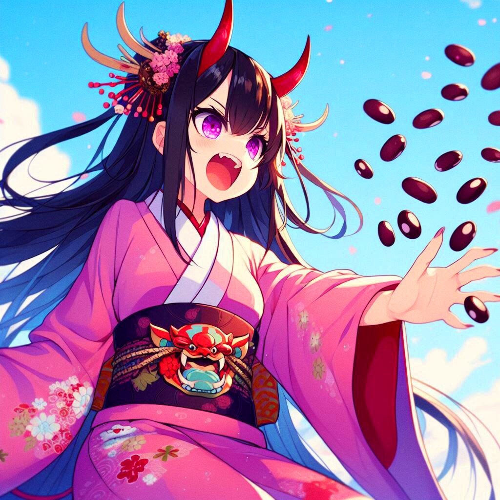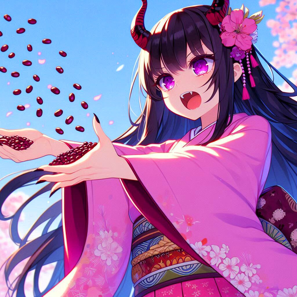 今回の作品は、着物色がピンクなイラストをまとめてみました。いつもは髪型別なのですが、今回は黒髪ロングオンリーでした!また、豆のまき方がなんだか不思議な作品が多いです…!