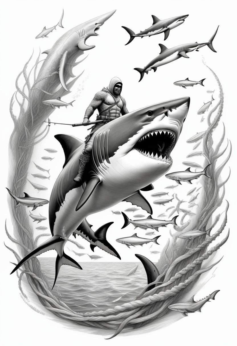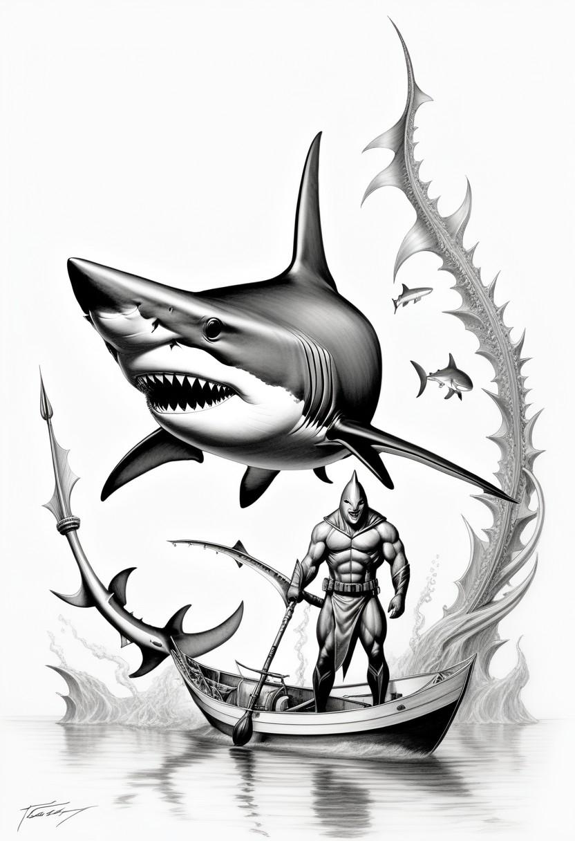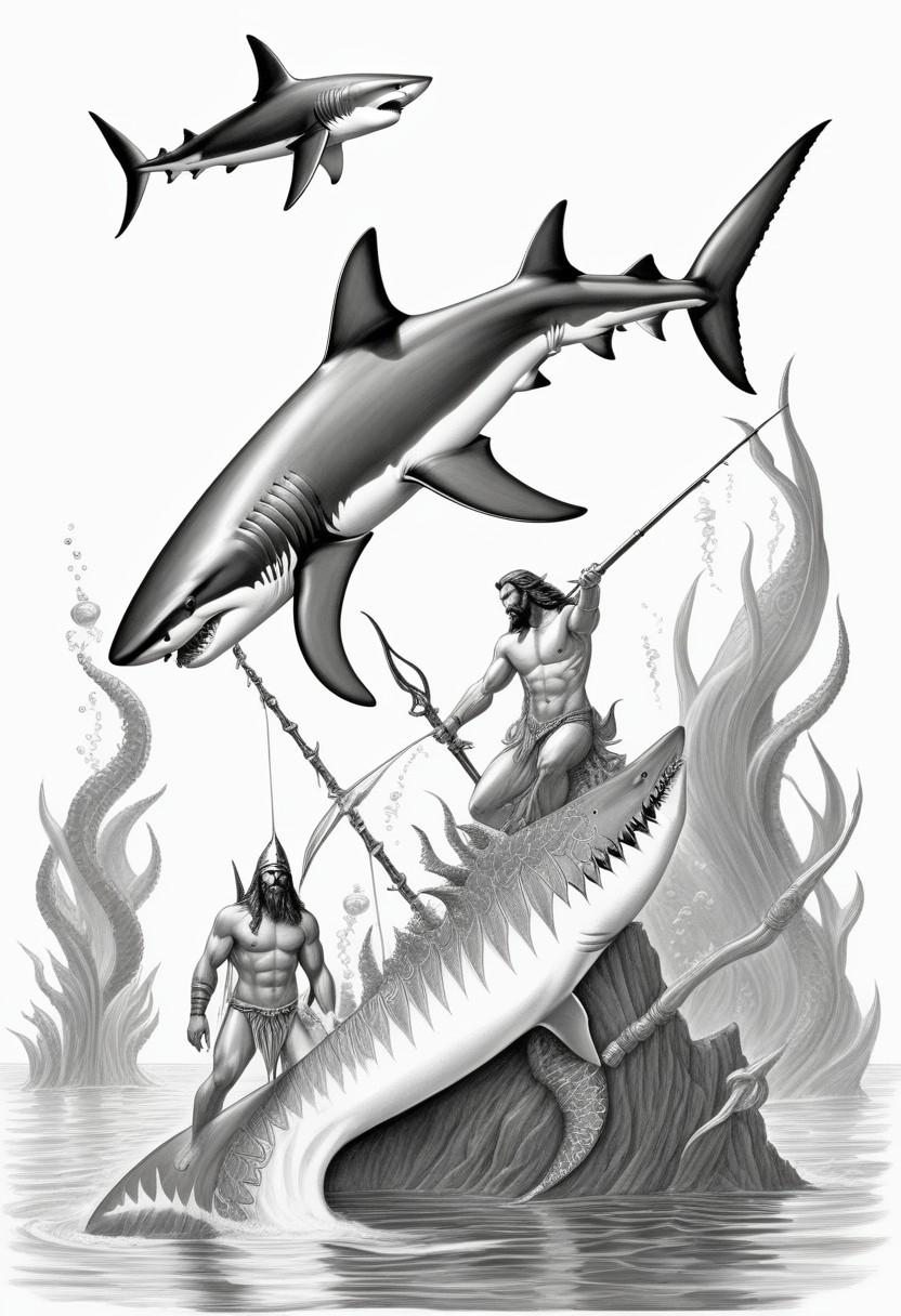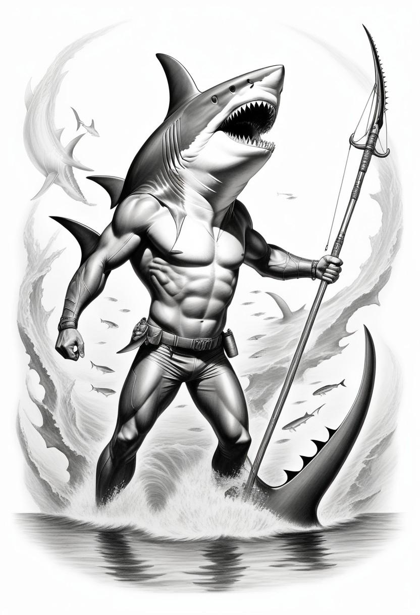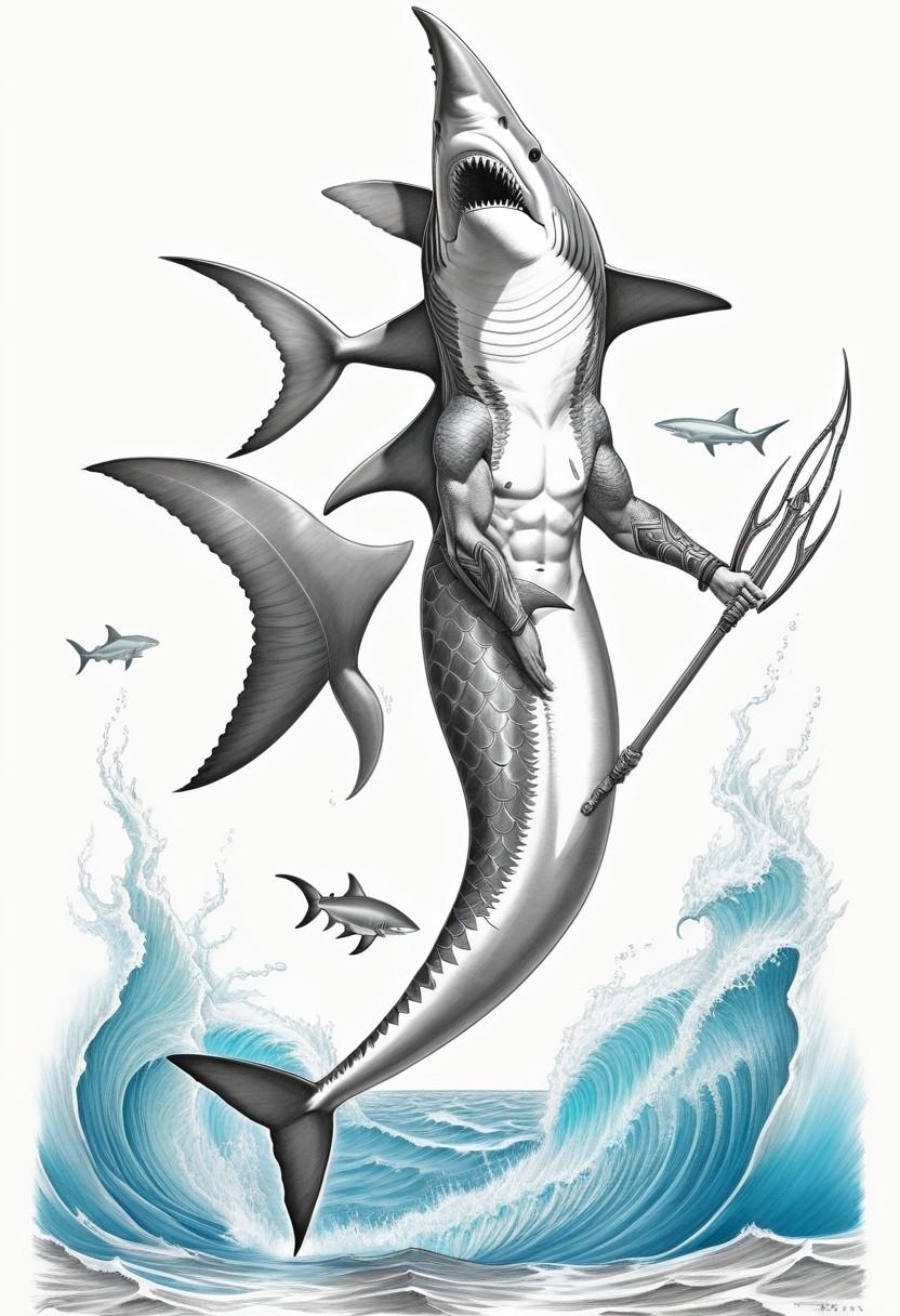 Tezany appears as a giant white shark, or a large, lithe shark-man. His weapon of choice is the fishing trident. His worshippers also use weapons made from shark teeth and other fish bones.