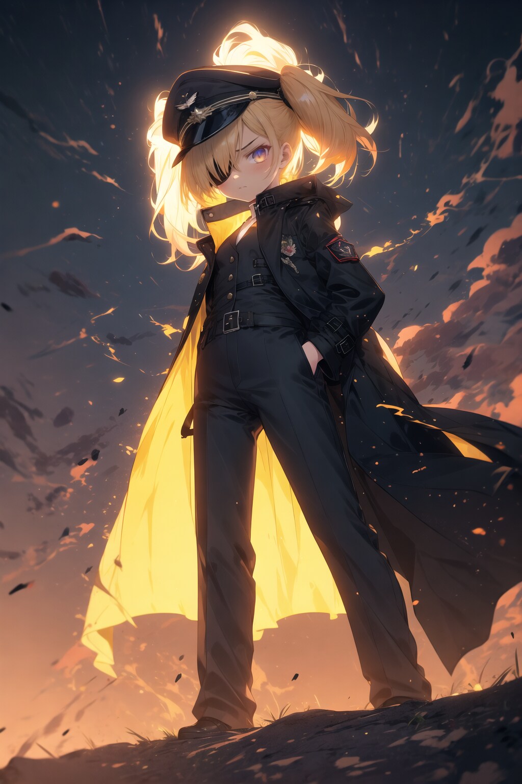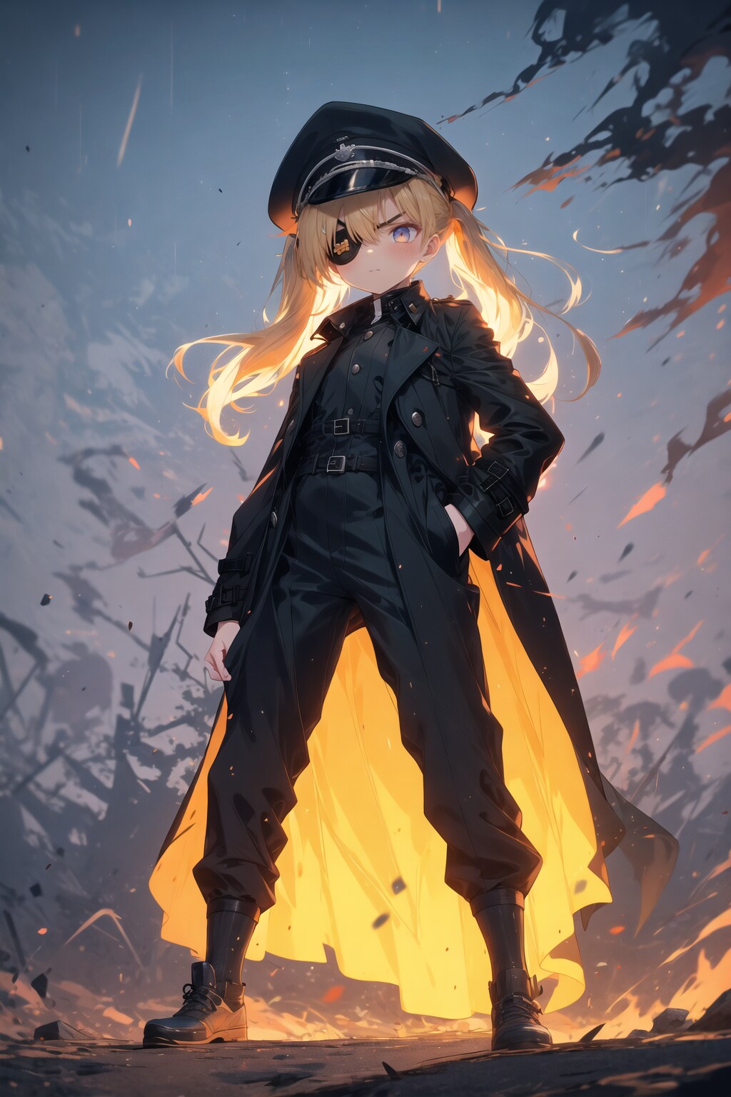 全身黒ずくめ、軍帽子、眼帯……あ、包帯と指貫グローブ忘れた。