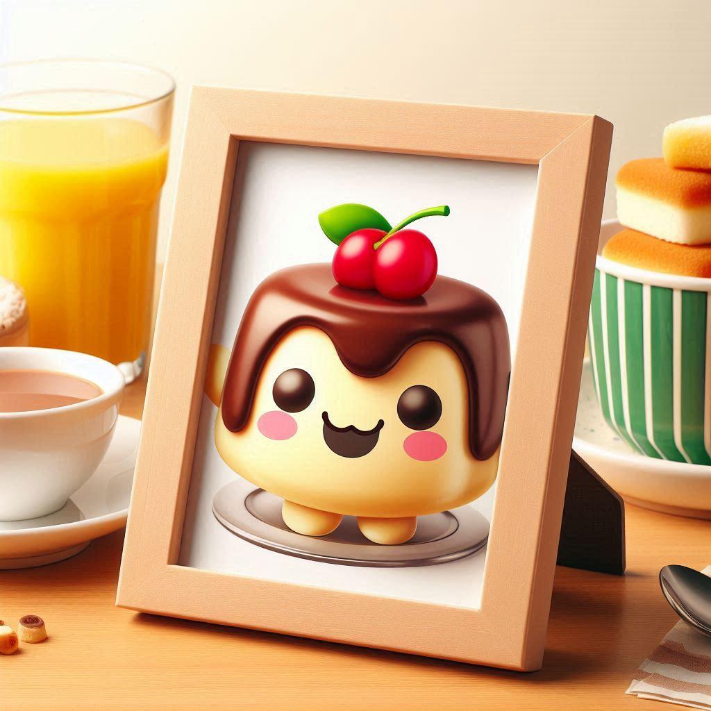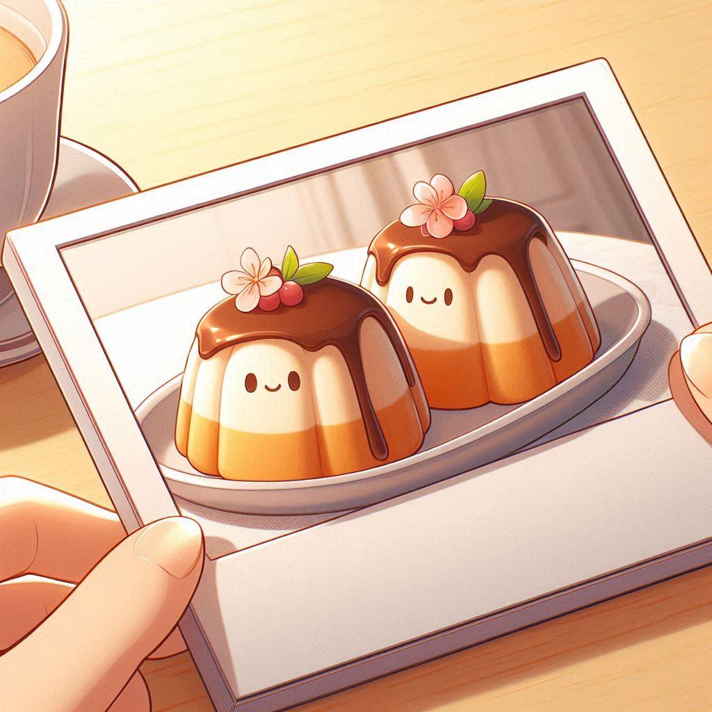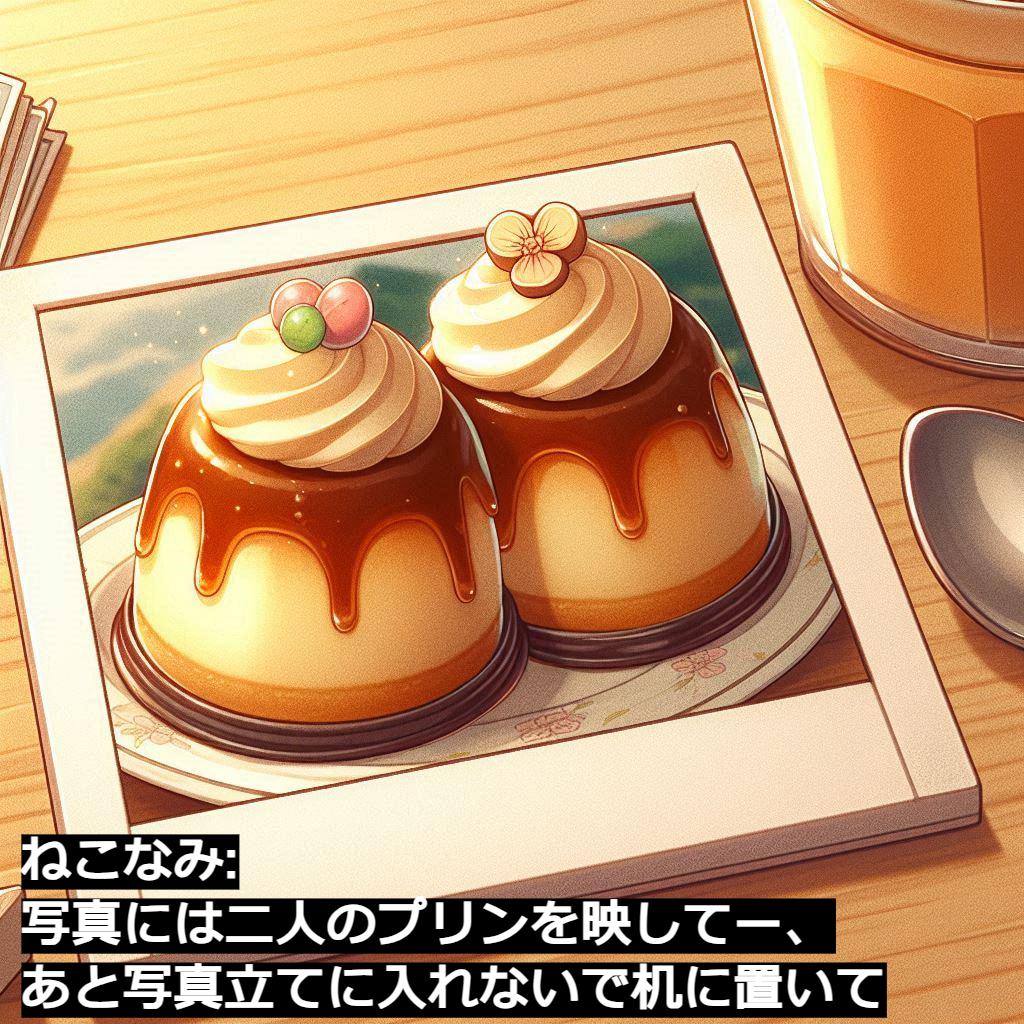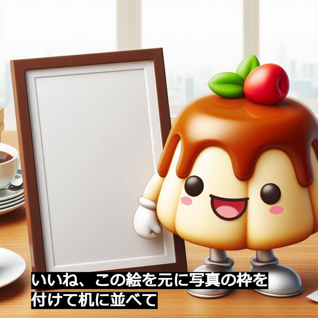 写真には二人のプリンを映してー、あと写真立てに入れないで机に置いて