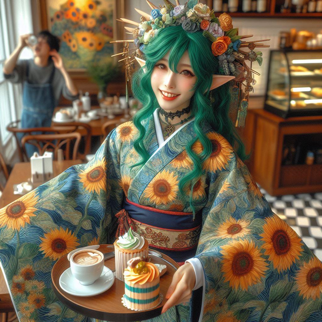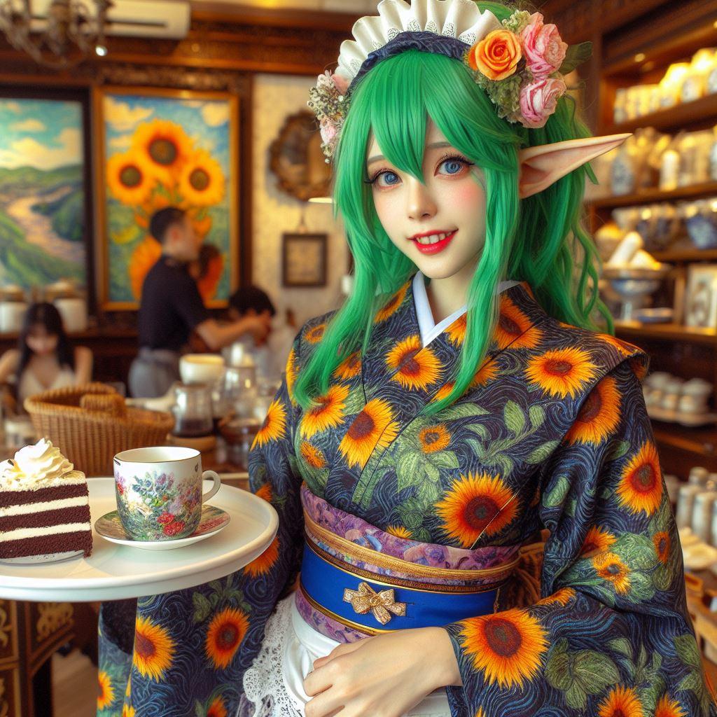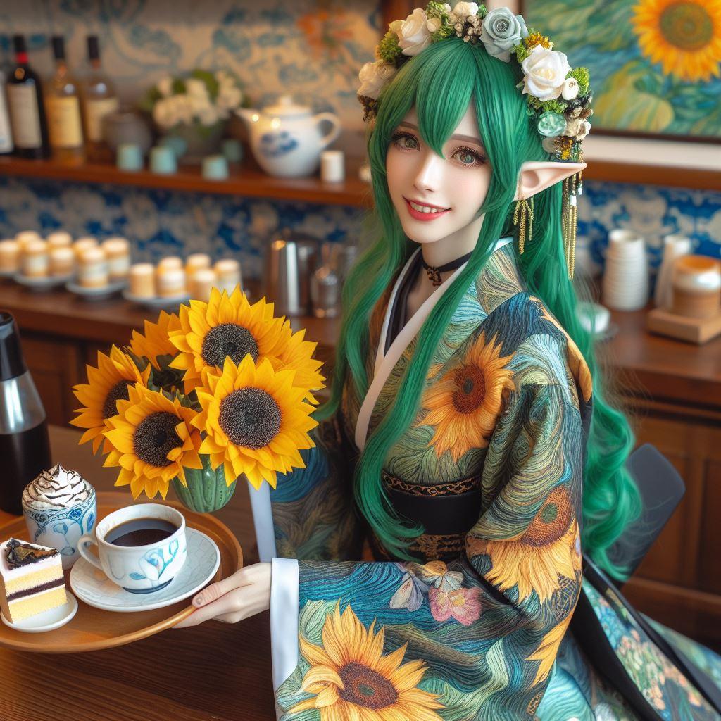 Mamekichiさんのリクエストで、着物カフェのメイドさんにゴッホのひまわり柄の着物を着てもらいました。