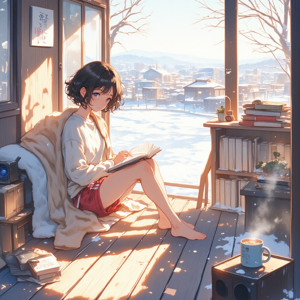 A young girl sitting on a wooden veranda illuminated by the pale sunlight of a tranquil winter afternoon. She wears a classic Japanese gym uniform: a white long-sleeved T-shirt and bright red bloomers,with her bare feet resting naturally on the wooden planks,slightly pink from the chilly air. A fluffy blanket is draped casually over her lap,offering warmth as she immerses herself in an open book. Her expressive blue eyes reflect her curiosity,while her dark,slightly wavy hair frames her face,gently tousled by the crisp winter breeze. Around her,a small bookshelf filled with books,a mug of steaming hot cocoa on a nearby table,and a portable speaker playing soft music add to the cozy atmosphere. In the background,a serene winter landscape unfolds,with bare trees and distant snow-covered hills,creating a peaceful seasonal ambiance.,