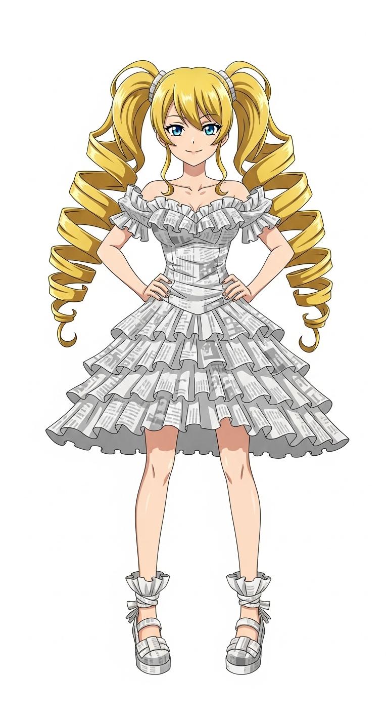 新聞紙で作ったドレスを身にまとう金髪ドリルヘアの女の子です
