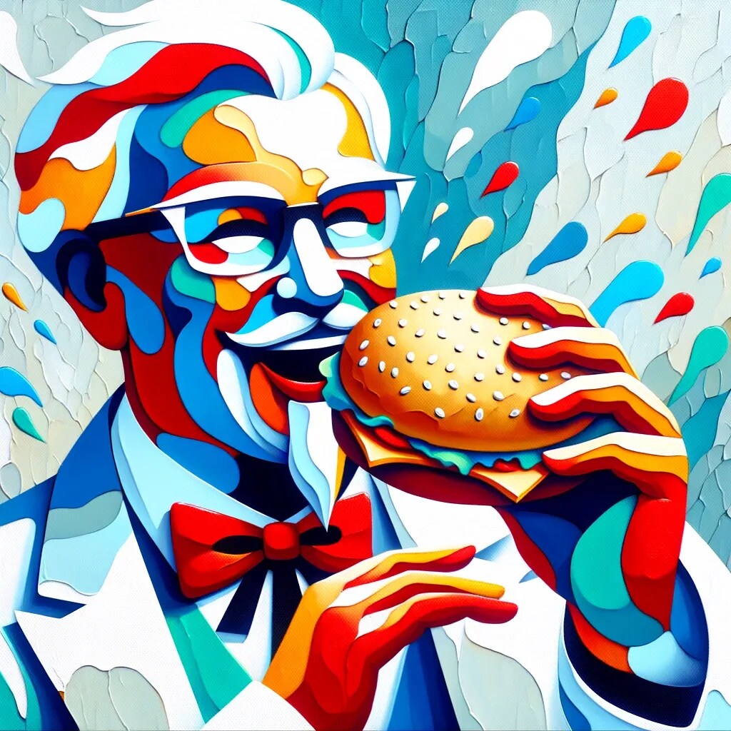 その日の昼下がり、カーネル・サンダースは、競争相手であるマクドナルドのハンバーガーを味わい、新たな発見と小さな冒険を楽しんだ。彼は知っていた、美味しいものは、どこにでも存在すると。
