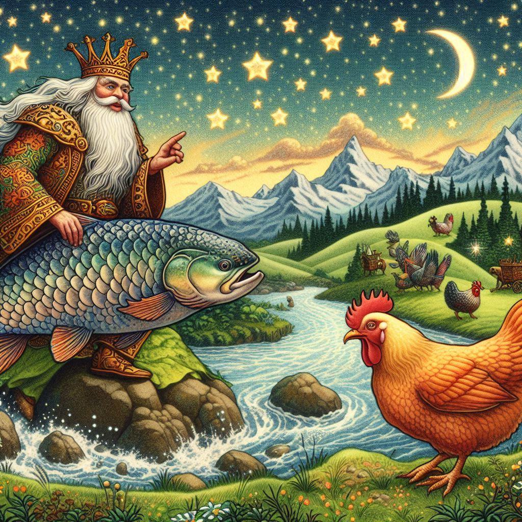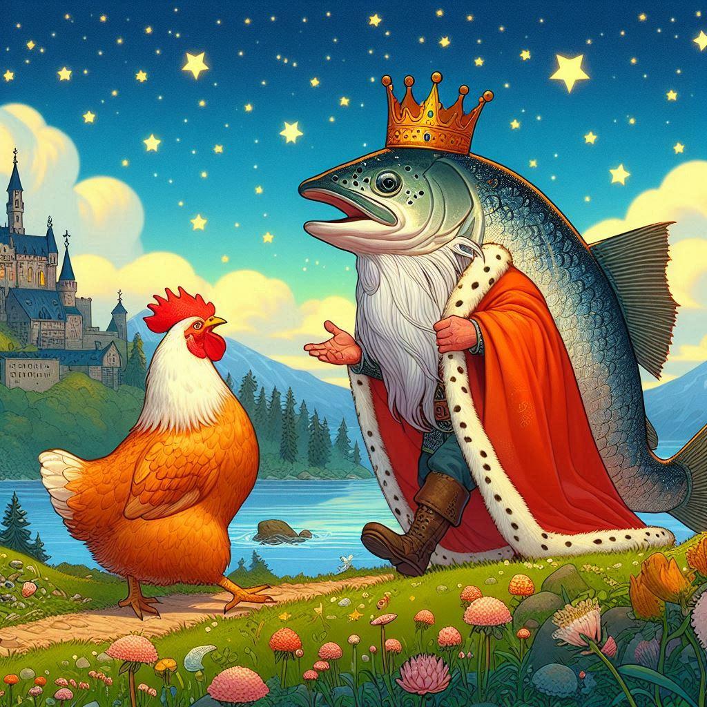鮭の王様が中世ファンタジー世界の星の綺麗な丘で
