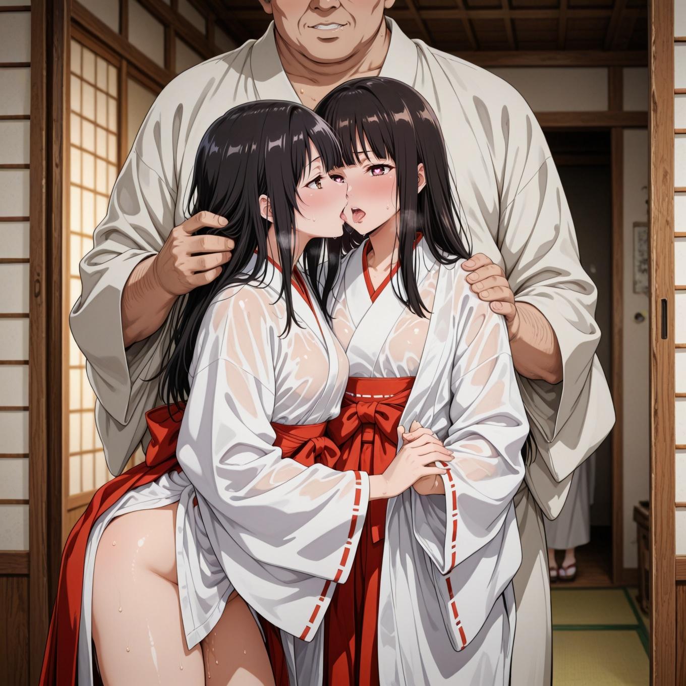 二人は顔を赤く染め、呼吸も荒い。汗や愛液で巫女服は既にびしょ濡れとなっていた。