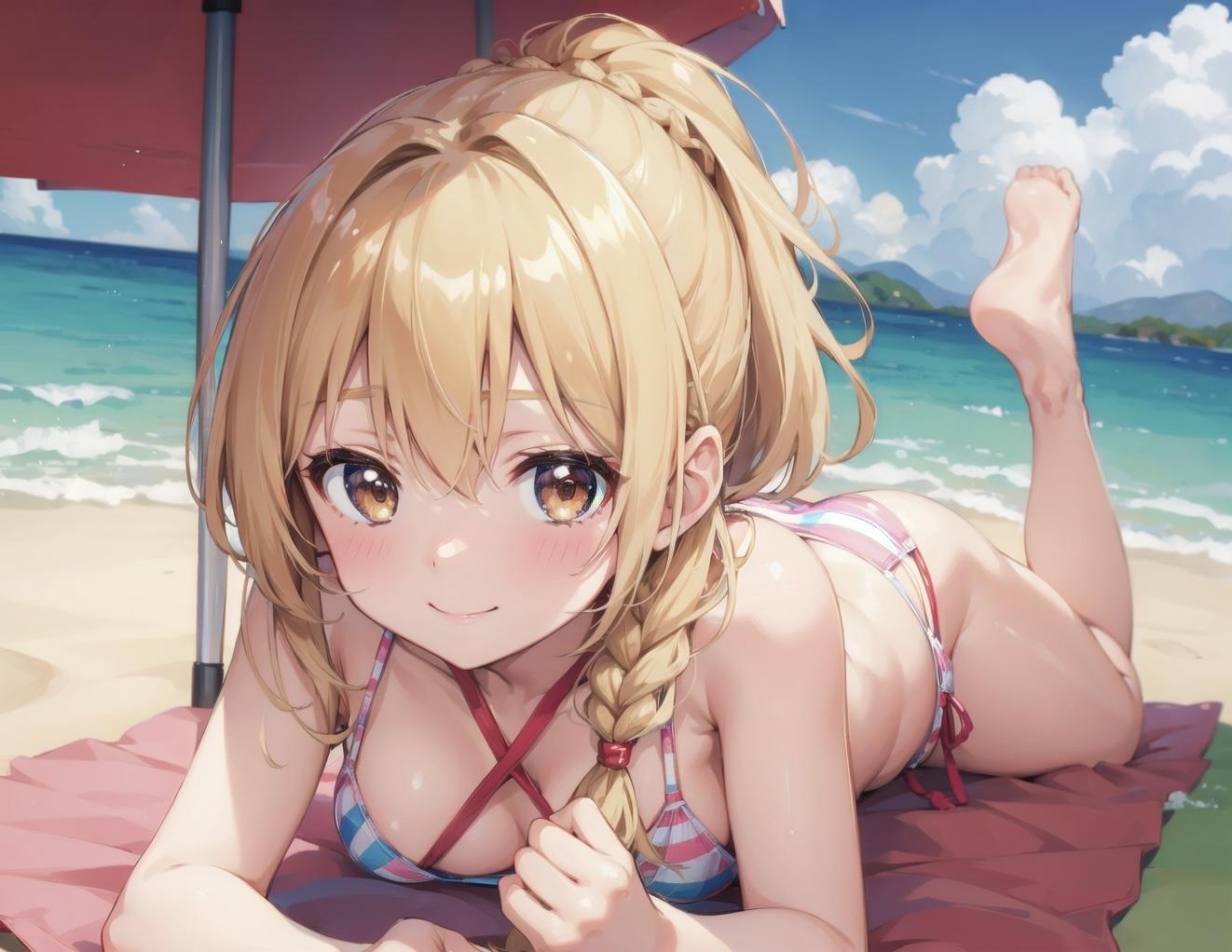 当時は"海で何か可愛い感じ"というのを出したく、いくつか作った中で水着姿を褒めてほしいお嬢さまとサンオイルを塗って欲しいお嬢さまを選びこれはお蔵入りにしましたが、表情がとても好きでしたので引っ張り出して来ました
