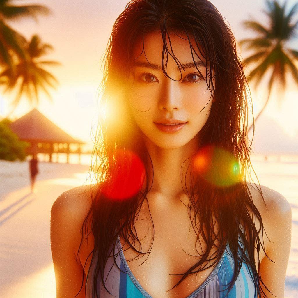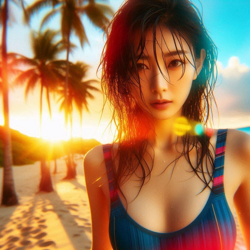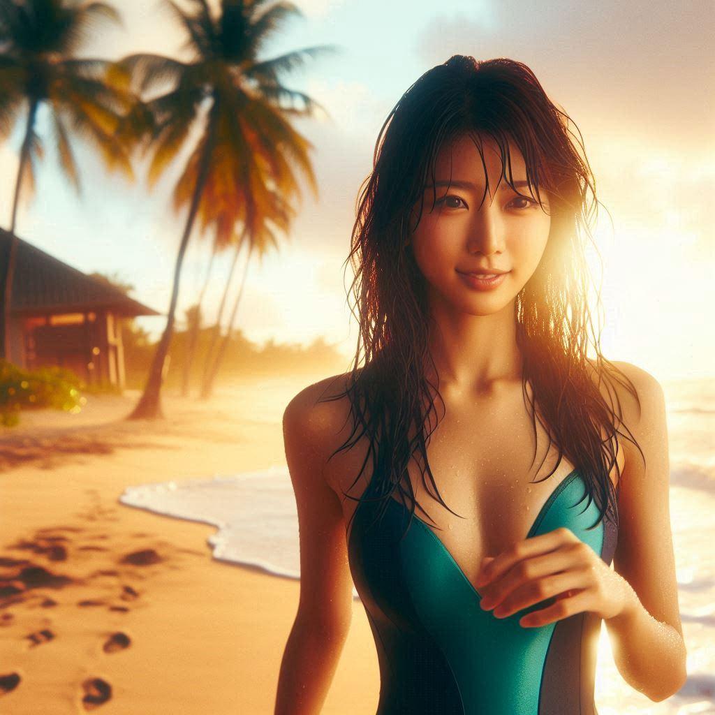 朝サーフィン、朝スイム…海での朝活を終えて帰る美女です。