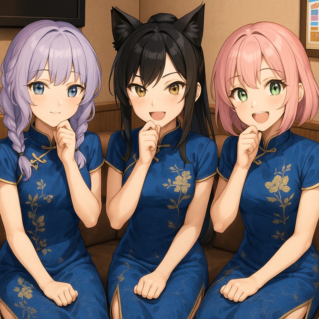紫の編み込み、黒髪ポニテに猫耳、ピンクのボブ。タイプは違えど、どこか自然に調和した三人の空気感。