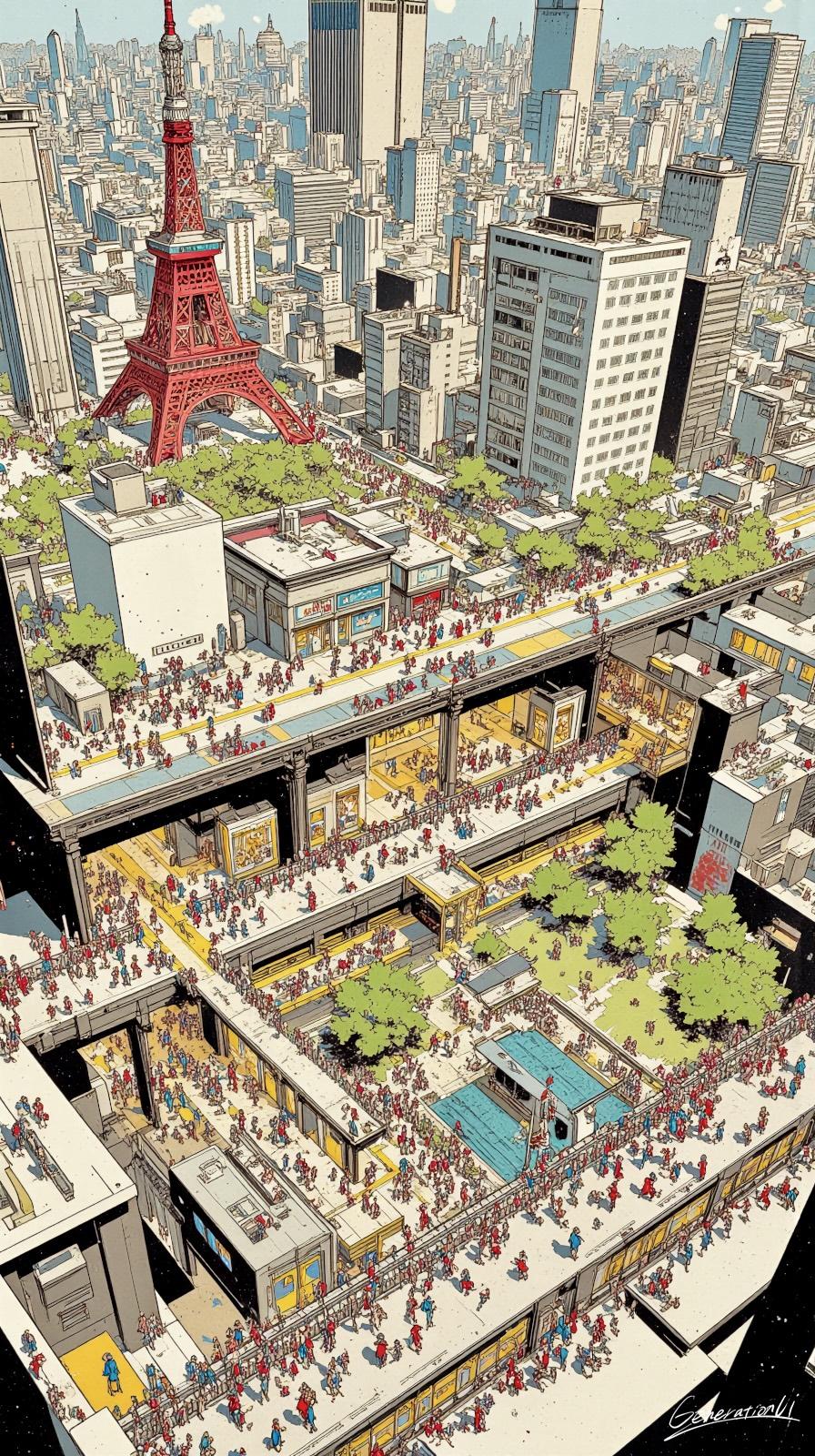 塔の出現とともに街は上下に分かれ、空中の歩道、地上の市場、そして地下の回廊が生まれた。