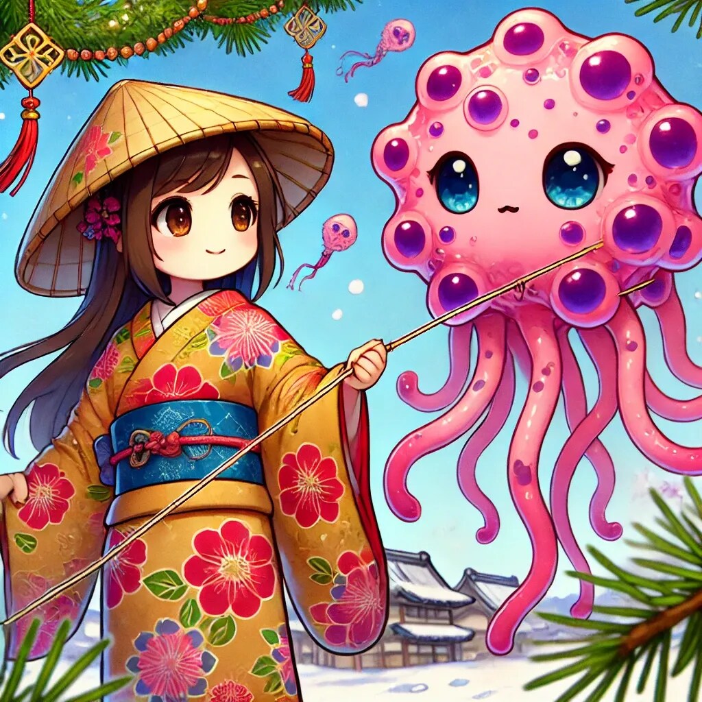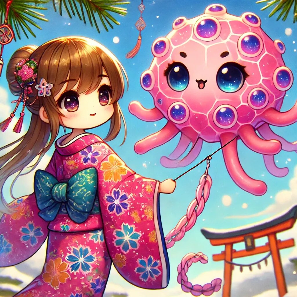 伝統的な正月遊びのタコ揚げが、こうして「ももほうくん」の個性で新しい解釈を生み出していて、とてもユニークです。触手が風に揺れながらバランスを取る姿は可愛らしくもあり、空で自由に飛び回っているかのような楽しさも感じられます。