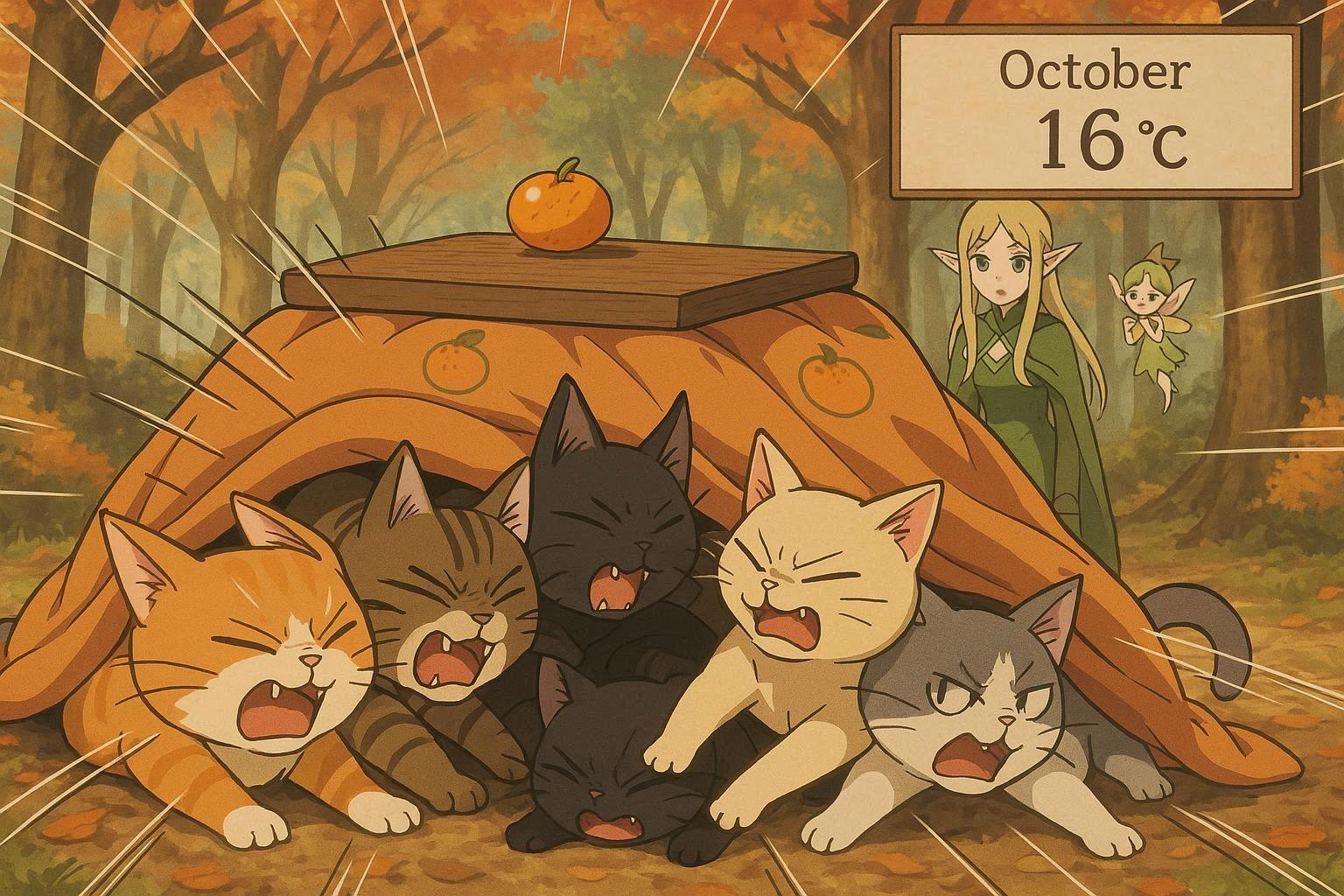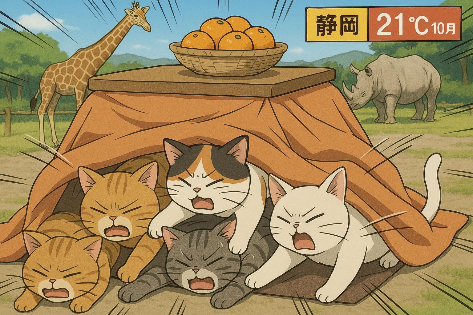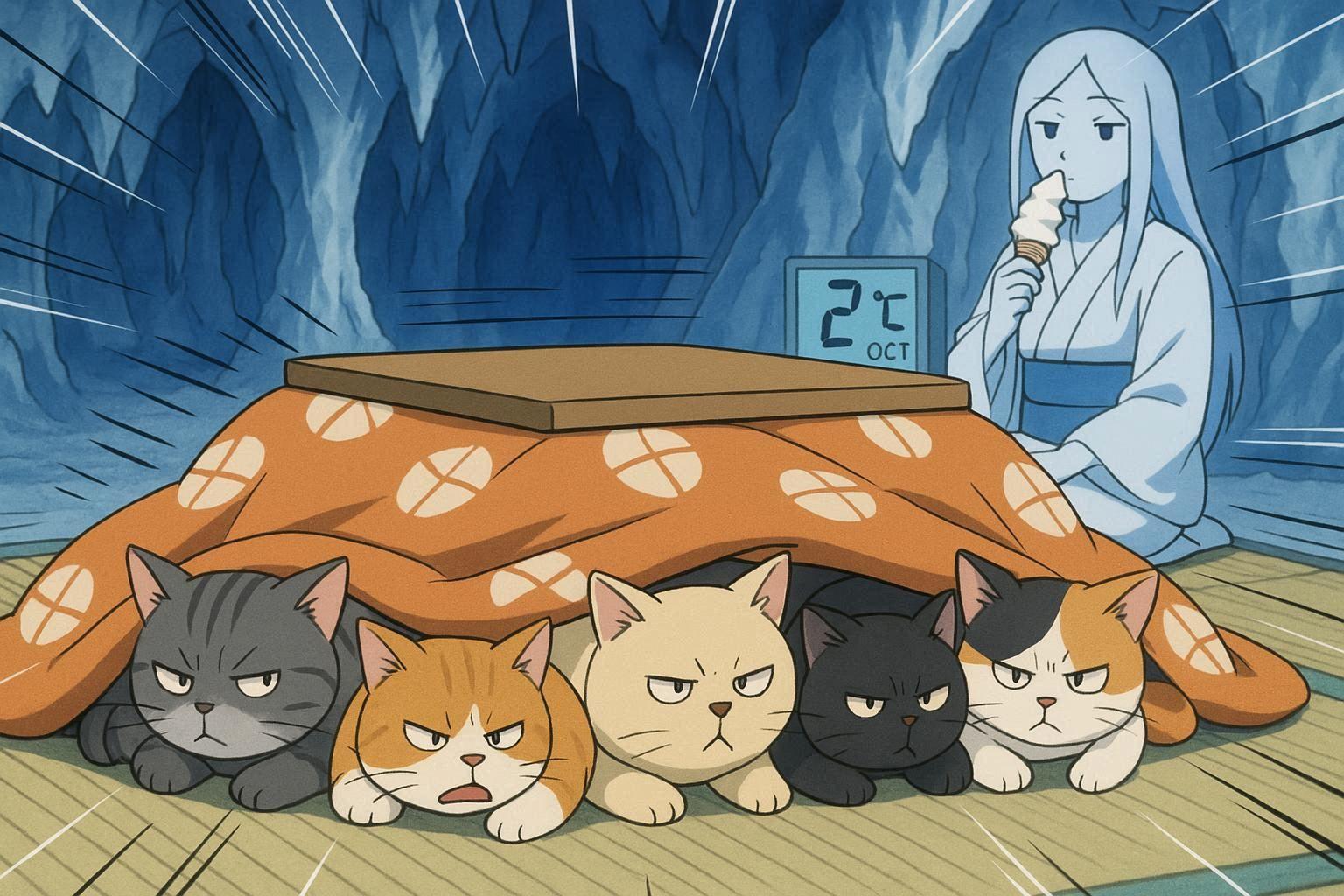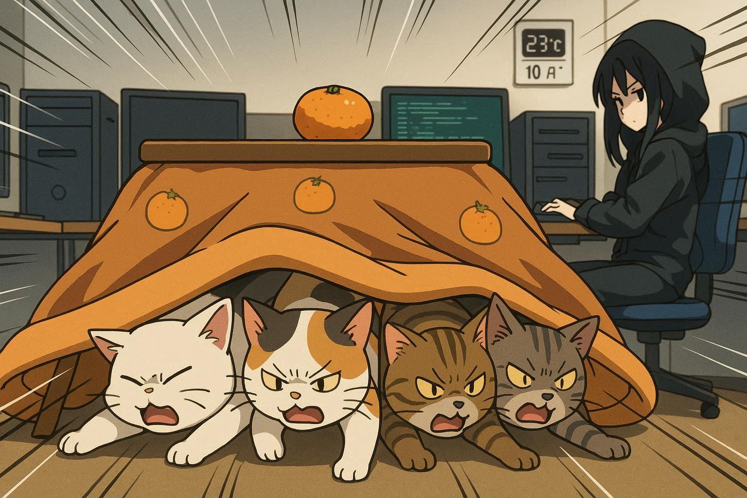 複数の猫がこたつの中に入り込んでいる, 猫同士で場所を取り合っている, 蜜柑,