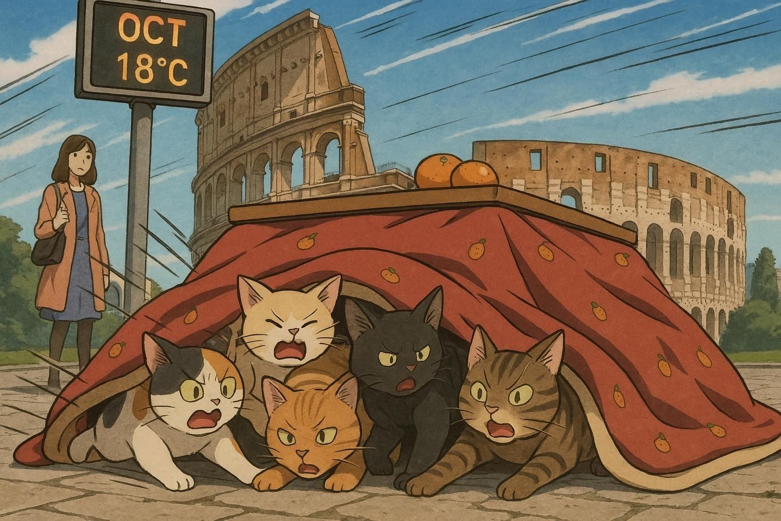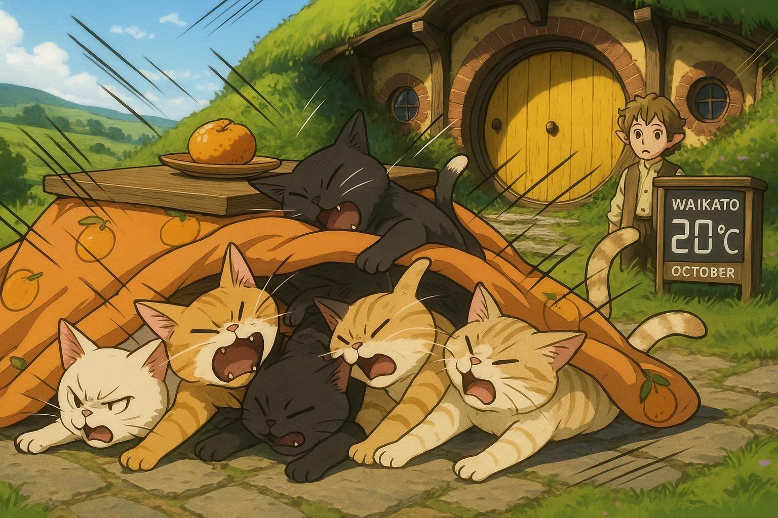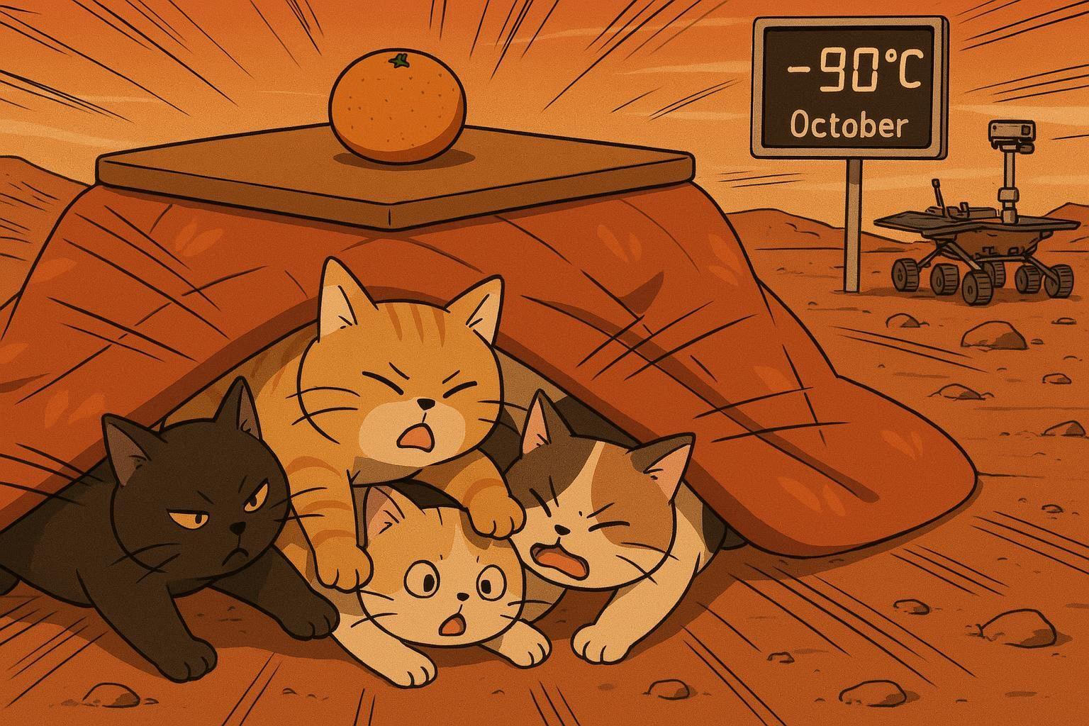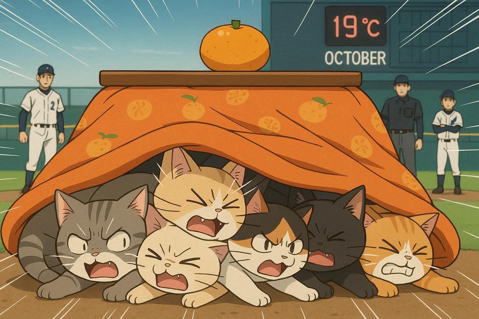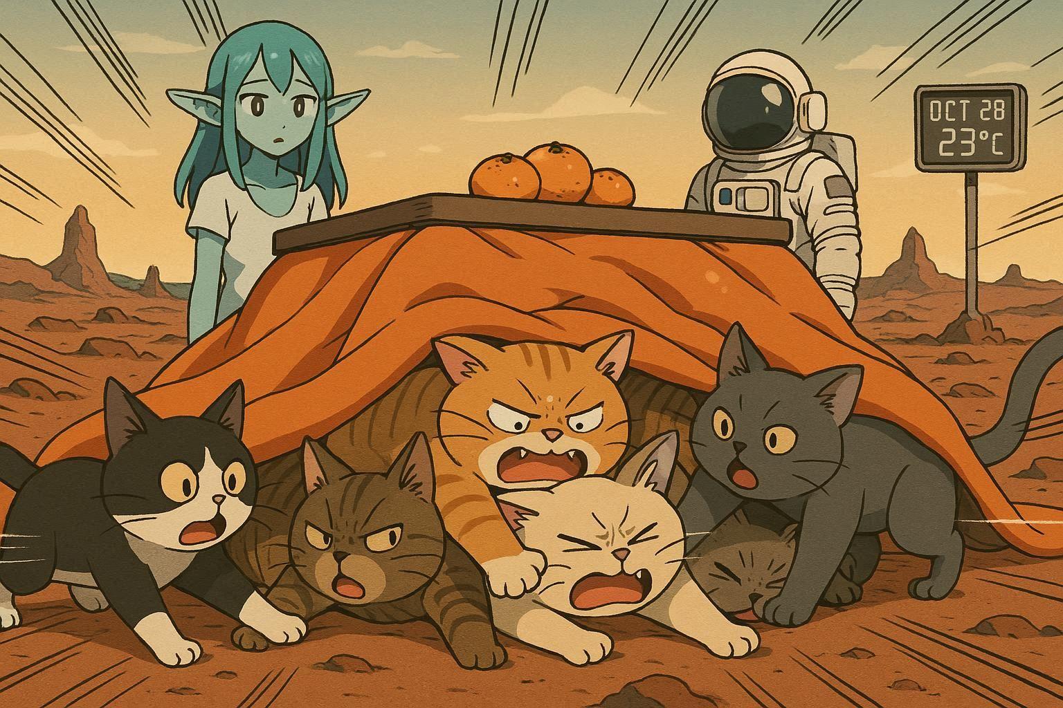 複数の猫がこたつの中に入り込んでいる, 猫同士で場所を取り合っている, 蜜柑,