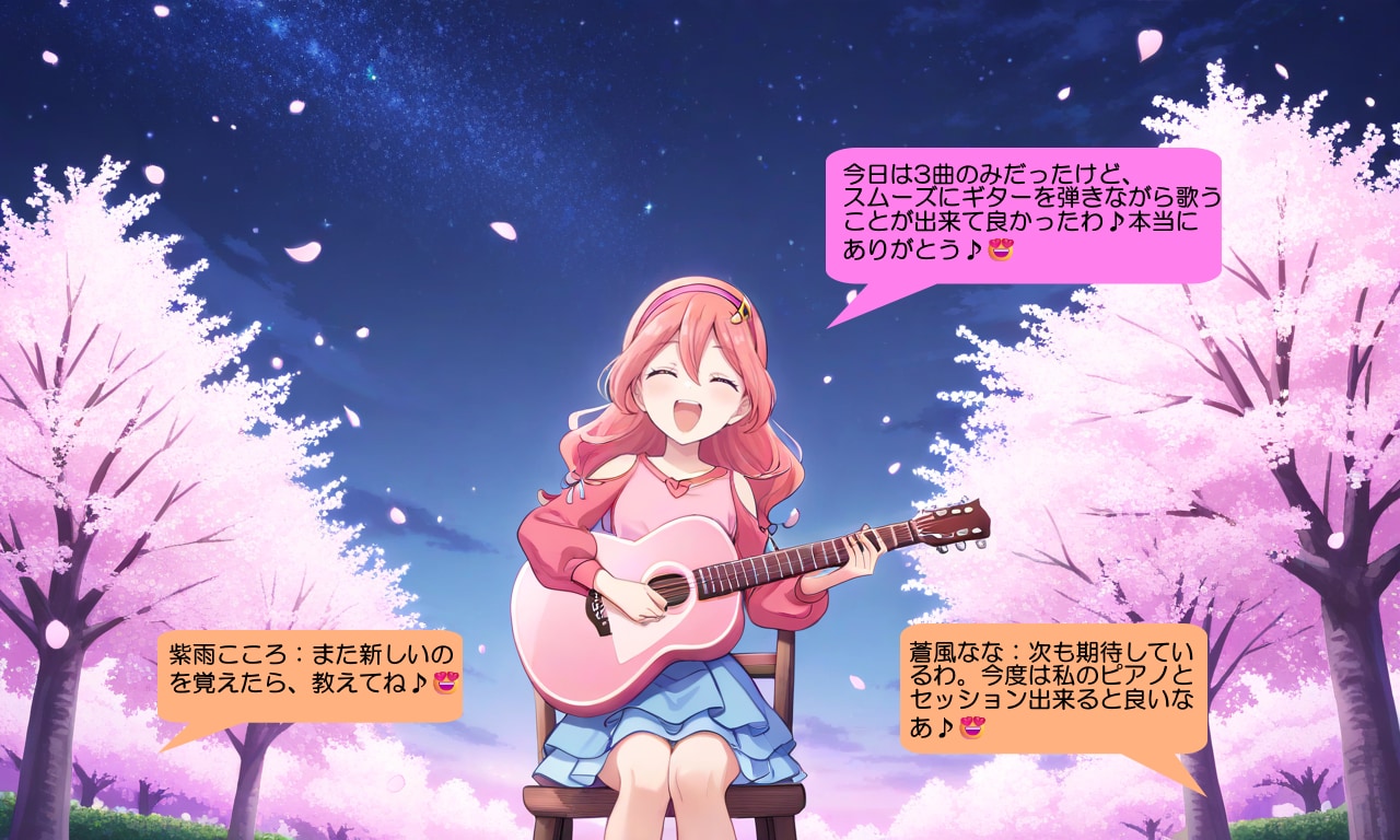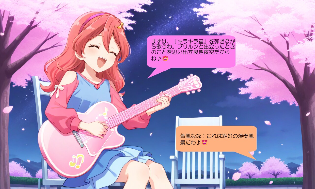 咲良うた:まずは、『キラキラ星』を弾きながら歌うわ。プリルンと出会ったときのことを思い出す良き夜空だからね♪😍