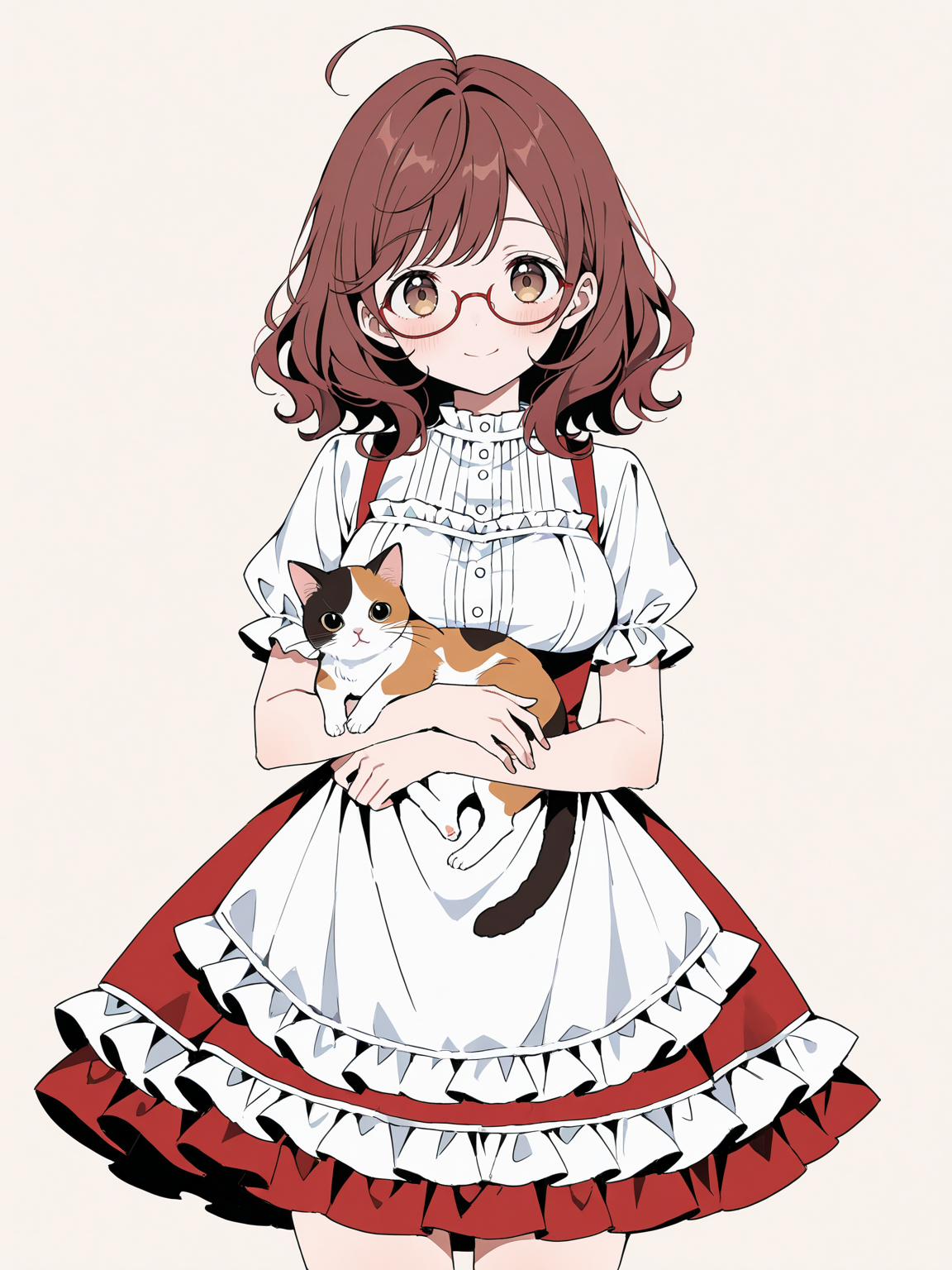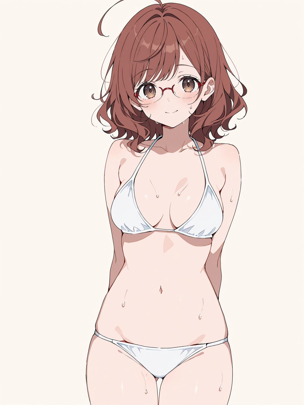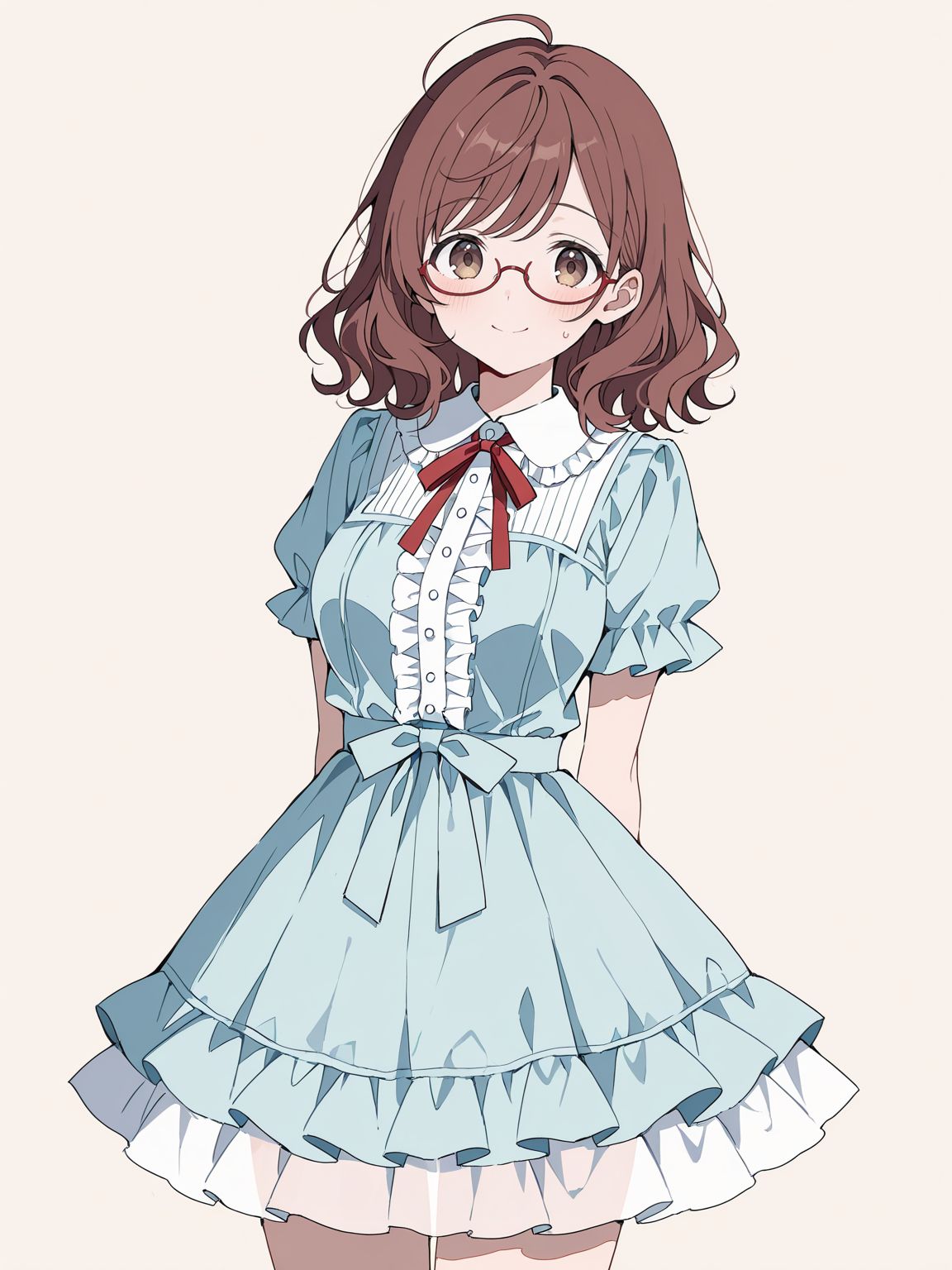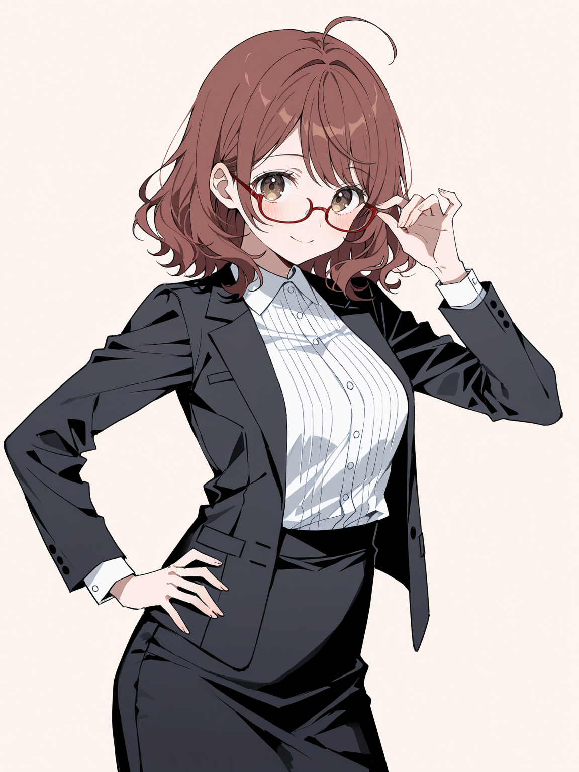 1girl,23 years old,short,medium breasts,brown red hair,medium hair,wavy hair,ahoge,swept bangs,big eyes,(dark brown eyes:1.3),gradient eyes,tareme,(under-rim_eyewear,red-framed_eyewear),