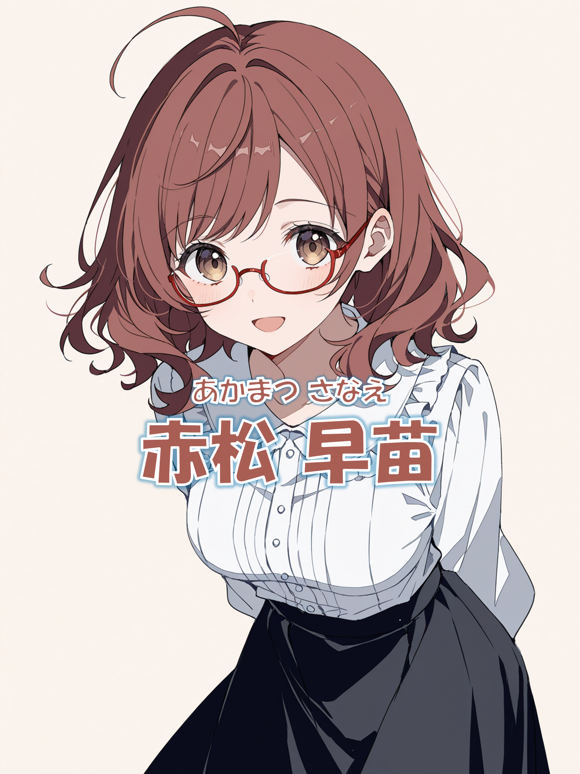 特徴:赤茶色のウエーブヘアー、アホ毛、メガネ(赤いアンダーリム)