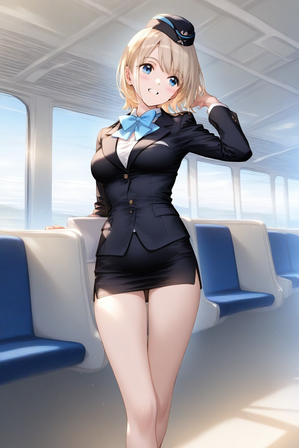 金髪ショート、青い瞳、黒のブレザーの制服姿で、