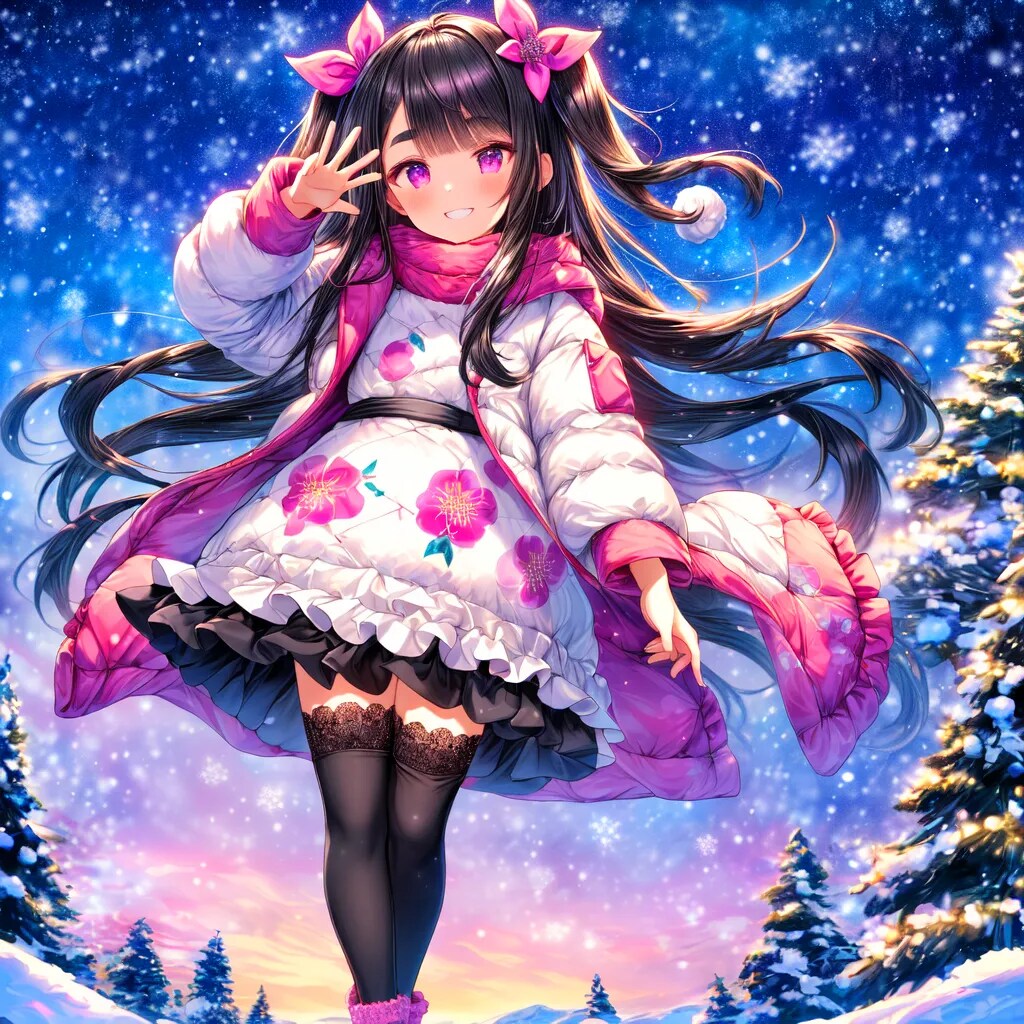 ダウンというワードが幅広いため、何を生成するか迷いましたが、この時期といえばダウンジャケット!というわけで、ダウンジャケットを着たうちの子を生成。
