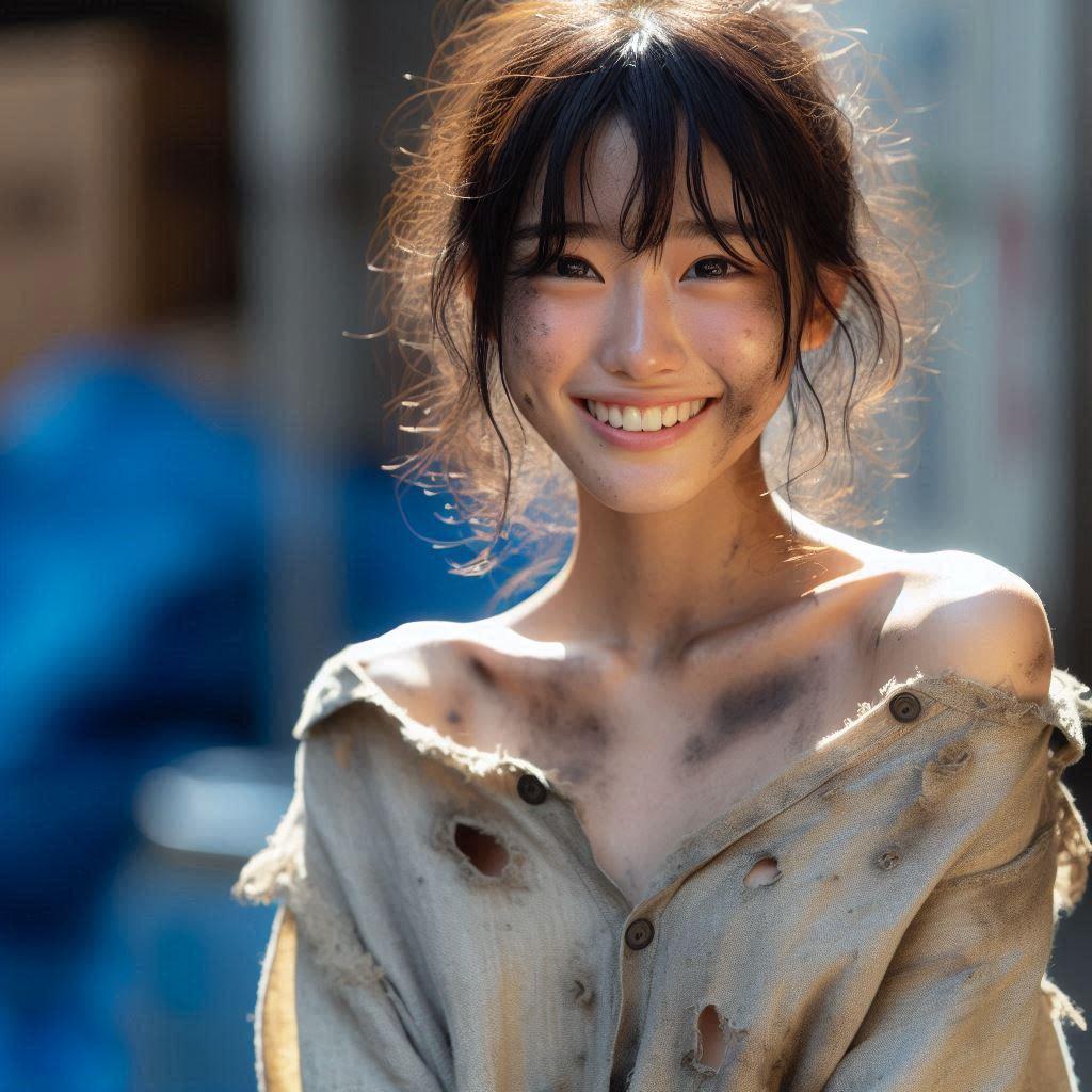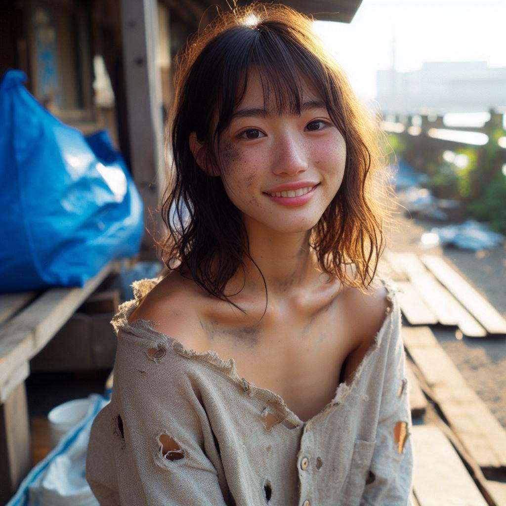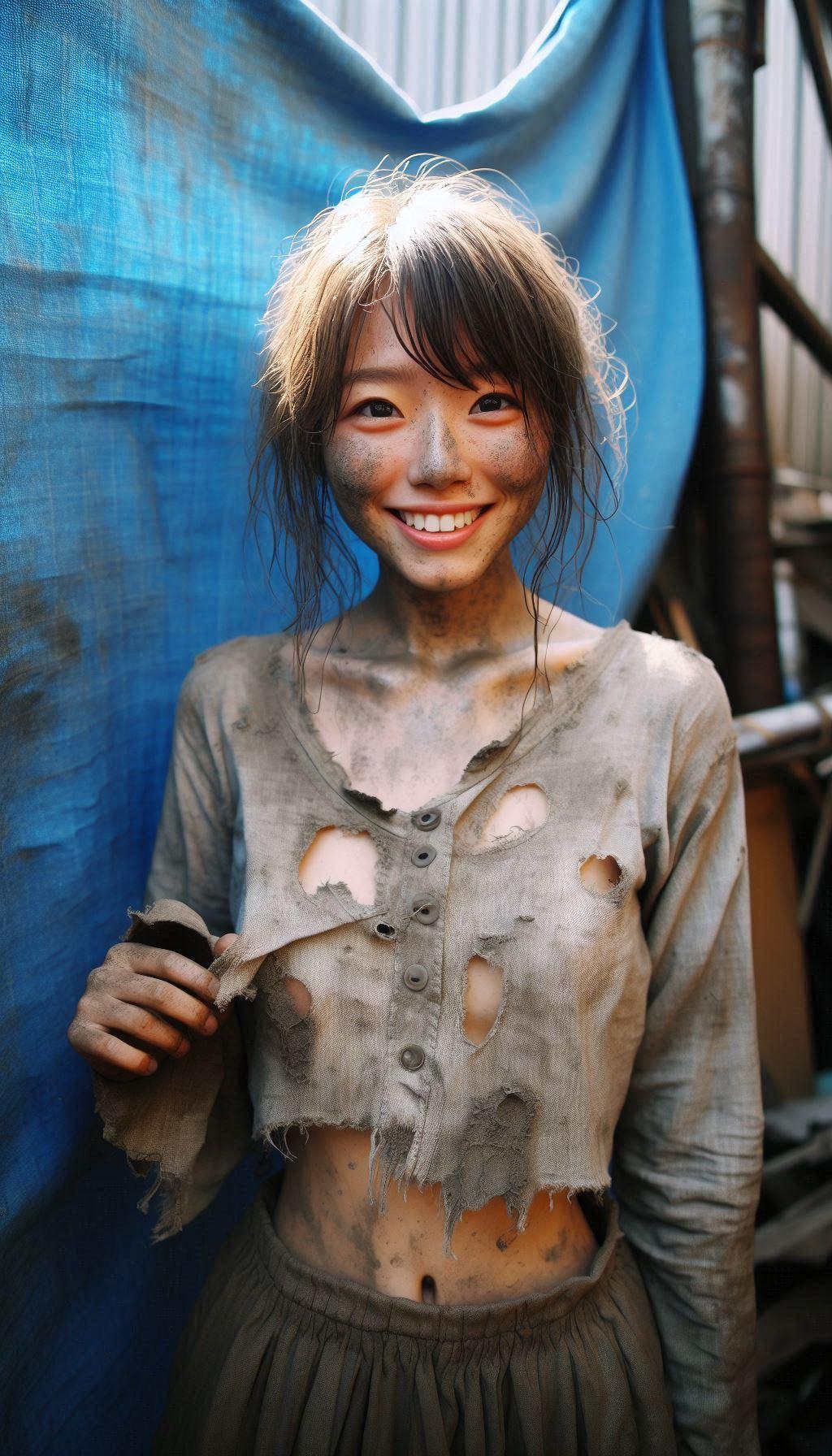 彼女が着ているのはボロ過ぎてオフショルダーに見える「服だった物」です。