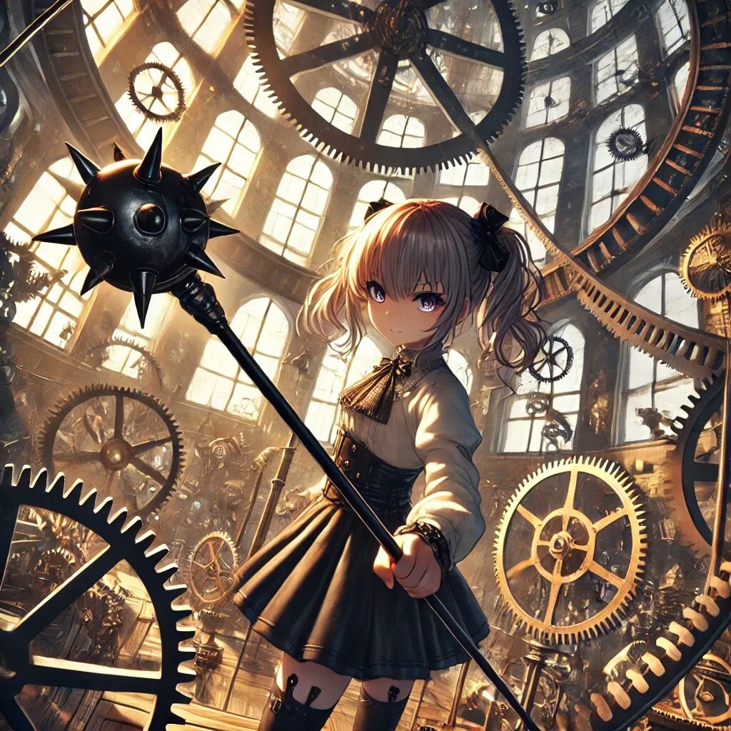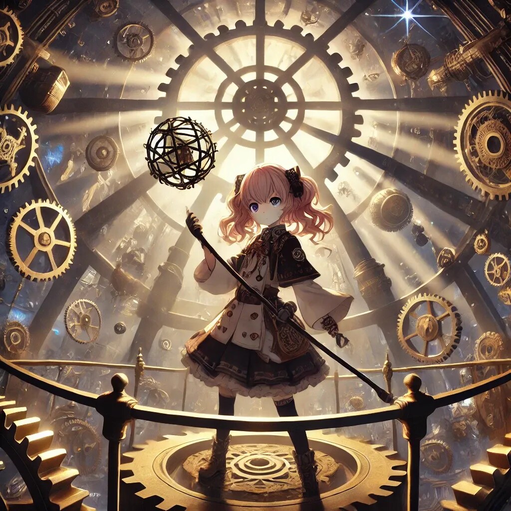 複雑な歯車に囲まれた雰囲気と、差し込む光がシーンに緊張感と神秘性を与えています。