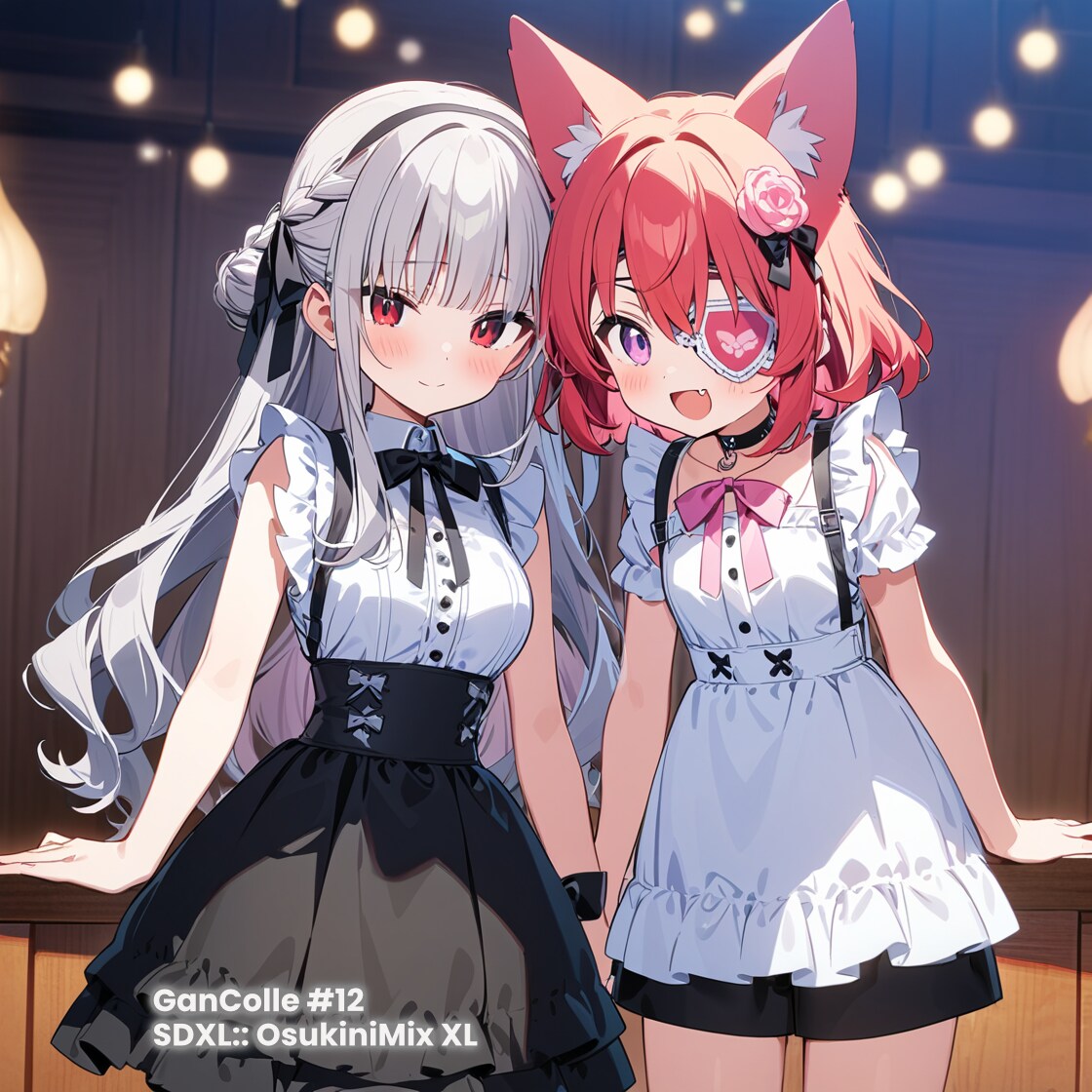 複数キャラ召喚ができる拡張機能Regional Prompterは人物の描写の呪文が多いと失敗して融合しちゃったり3人以上になっちゃったりの挙動もします。なので試行の中で地雷系武装のいくつかは削除。ピンクも考えたのですが最終的に二人とも上は白(左のエリアーヌは実はグレーを指定しています)、black tieで黒のリボン、下は黒で統一して、ガチャ試行の中でリボンもお揃いになってうまく行ったものを採用して制作しています。