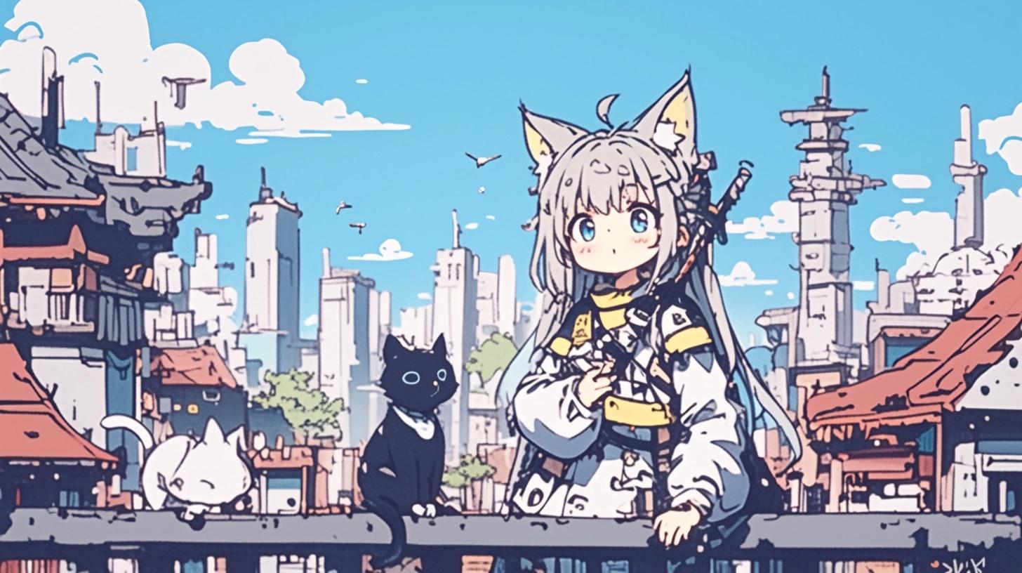 猫耳剣士と白黒ニャンズが見上げる未来の街――いざ、新たな冒険の幕開け!