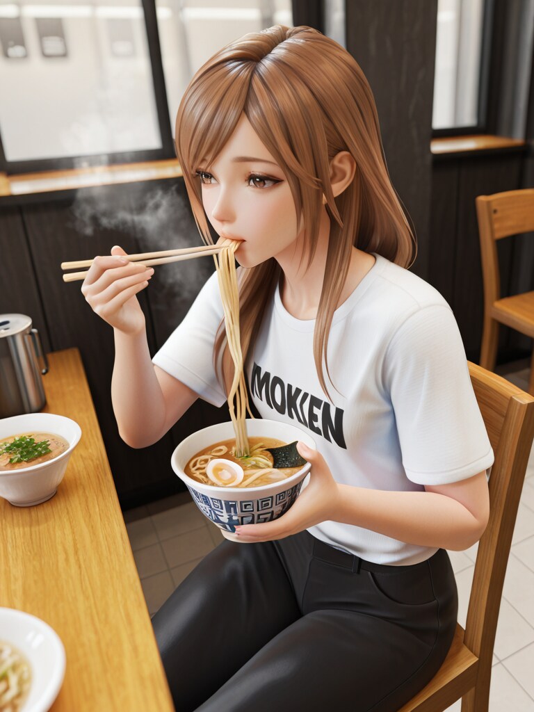 さて、プロンプトについてですが麺とお箸が融合してしまう事が多かったです。当初”Holding_Chopstick”と入れていたのですがお箸を両手で使って食べているという珍妙な絵面が頻繁に出てしまいましたw。