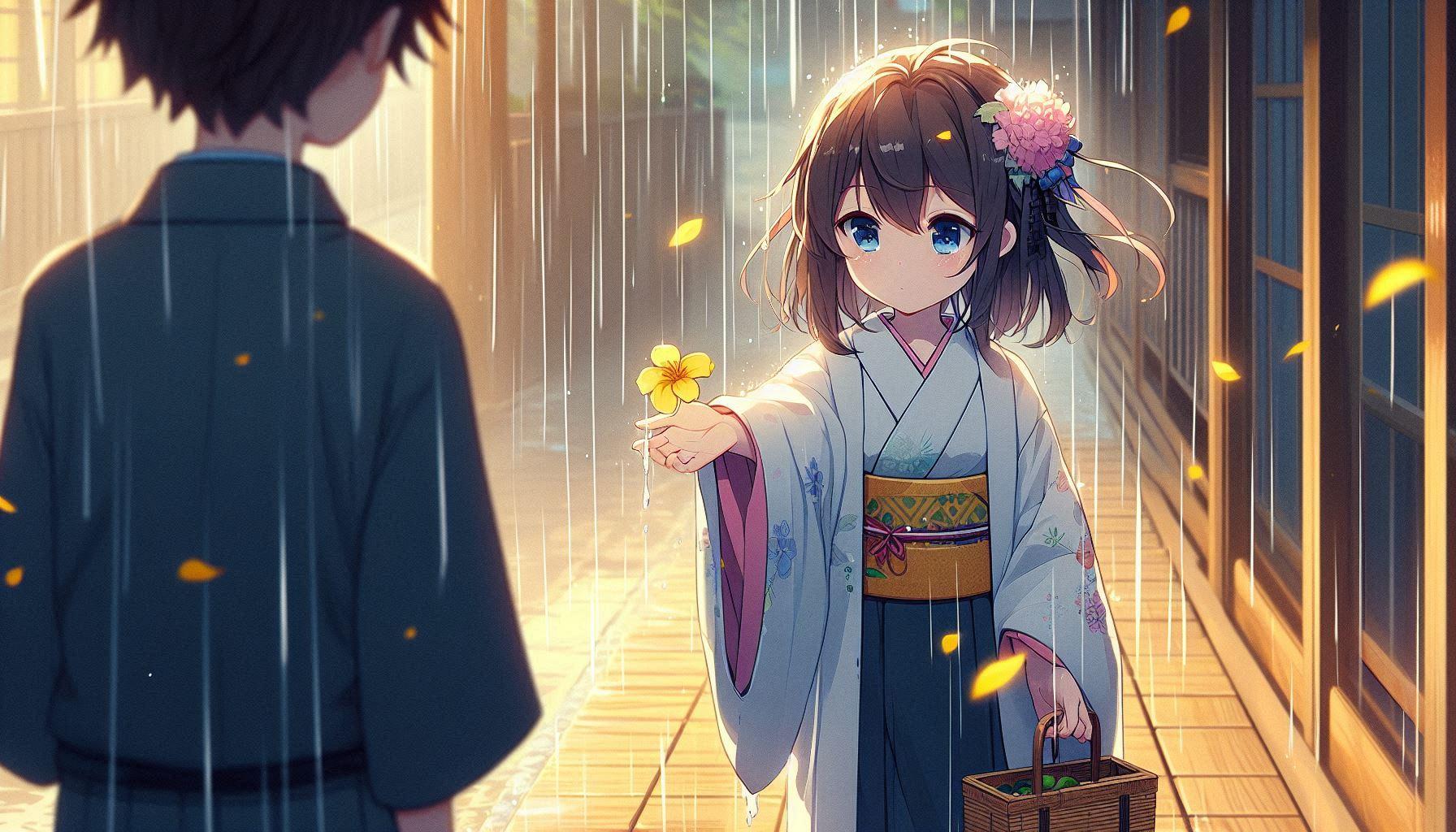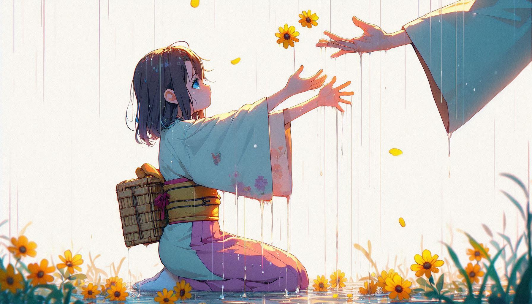 ある日、道灌は狩りに出かけたんやけど、途中で急に雨が降ってきたんよ。しゃーないから、近くの農家に駆け込んで「すんまへん、蓑(みの)貸してくれへんか?」と頼んだんや。