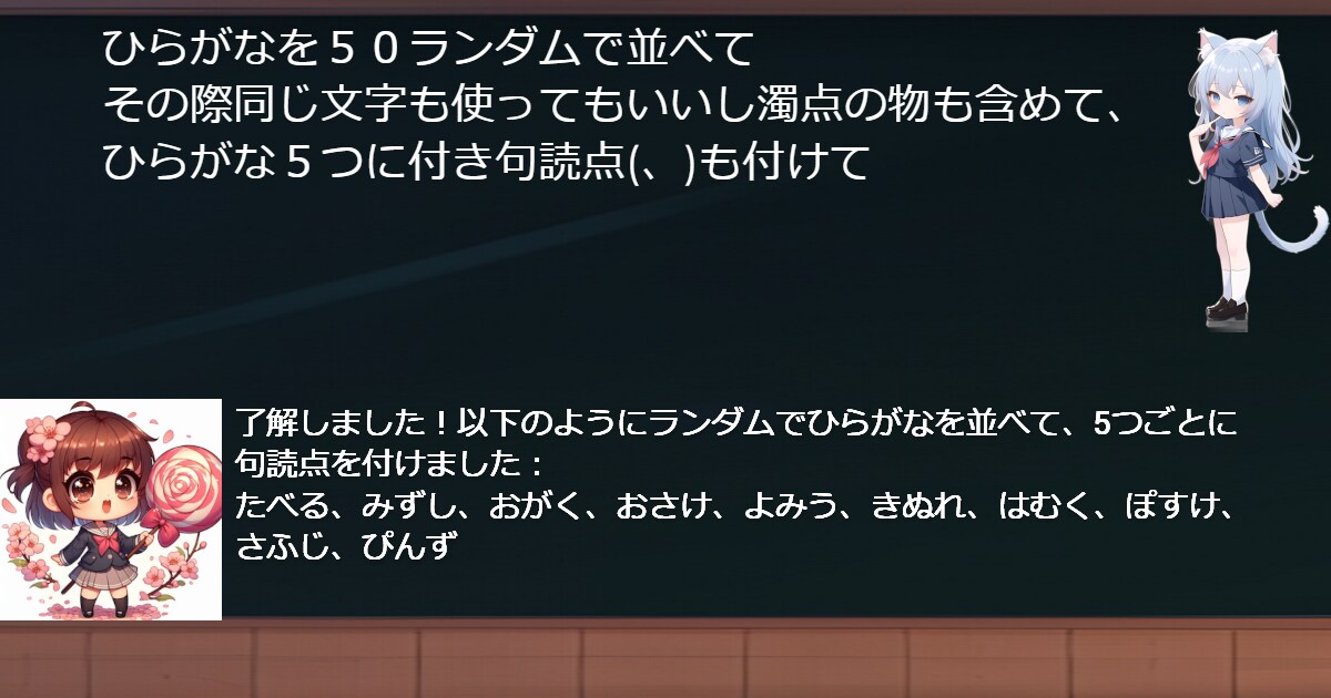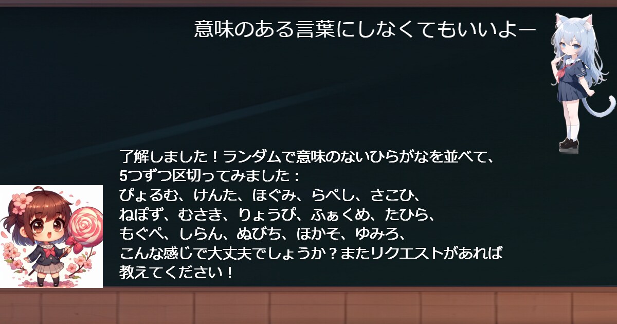 C:以下のように、再度ひらがなをランダムで並べ、5つずつ区切りました: