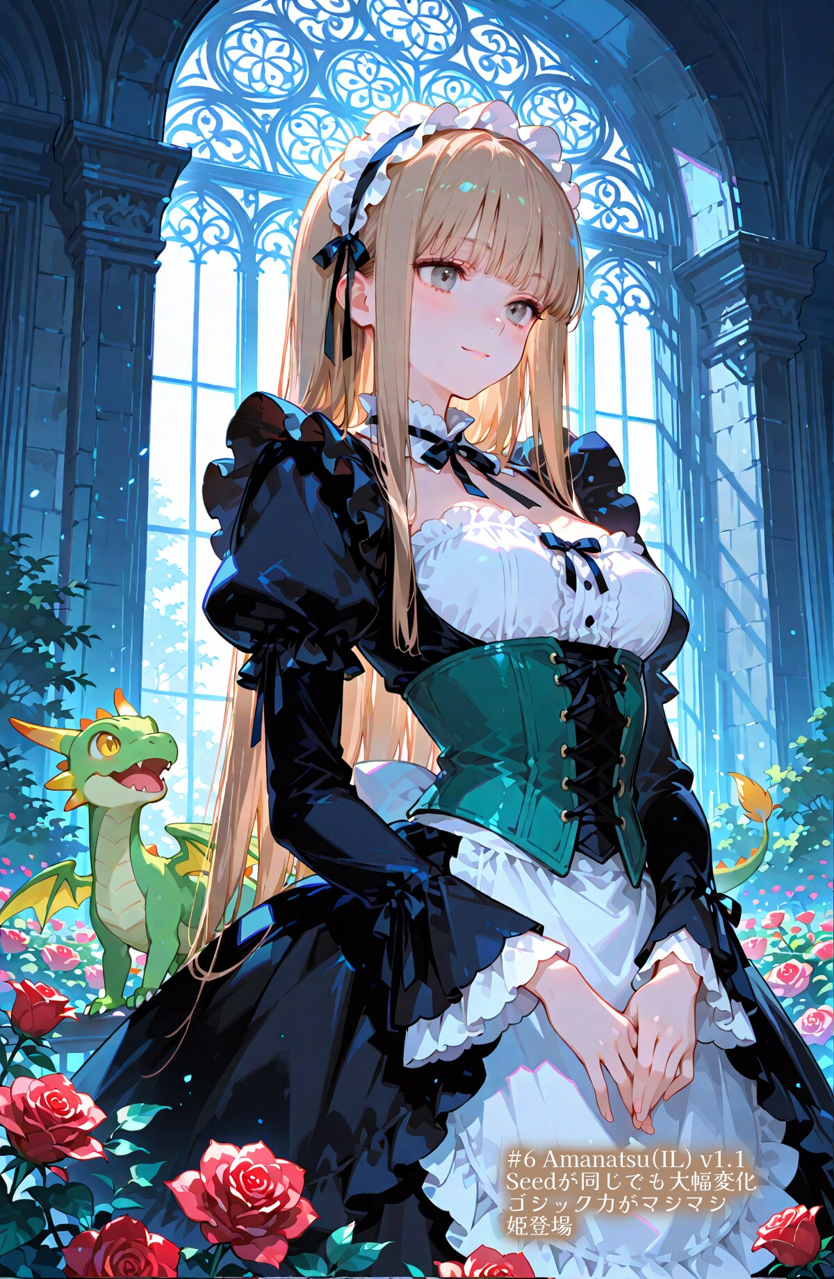 ●#6枚目:Amanatsu(IL) v1.1:これ呪文とSeedまでぜんぶ同じなんですが、突然の大幅変化。ゴシックがマシマシで頭身が上がったどこかの姫が登場しました🤣