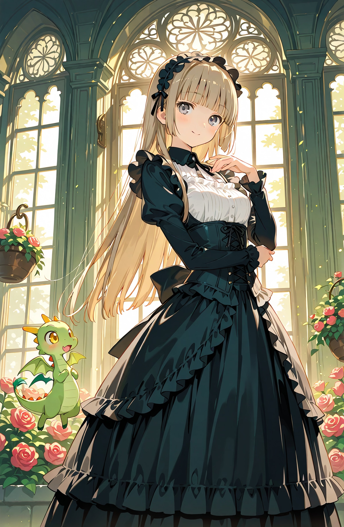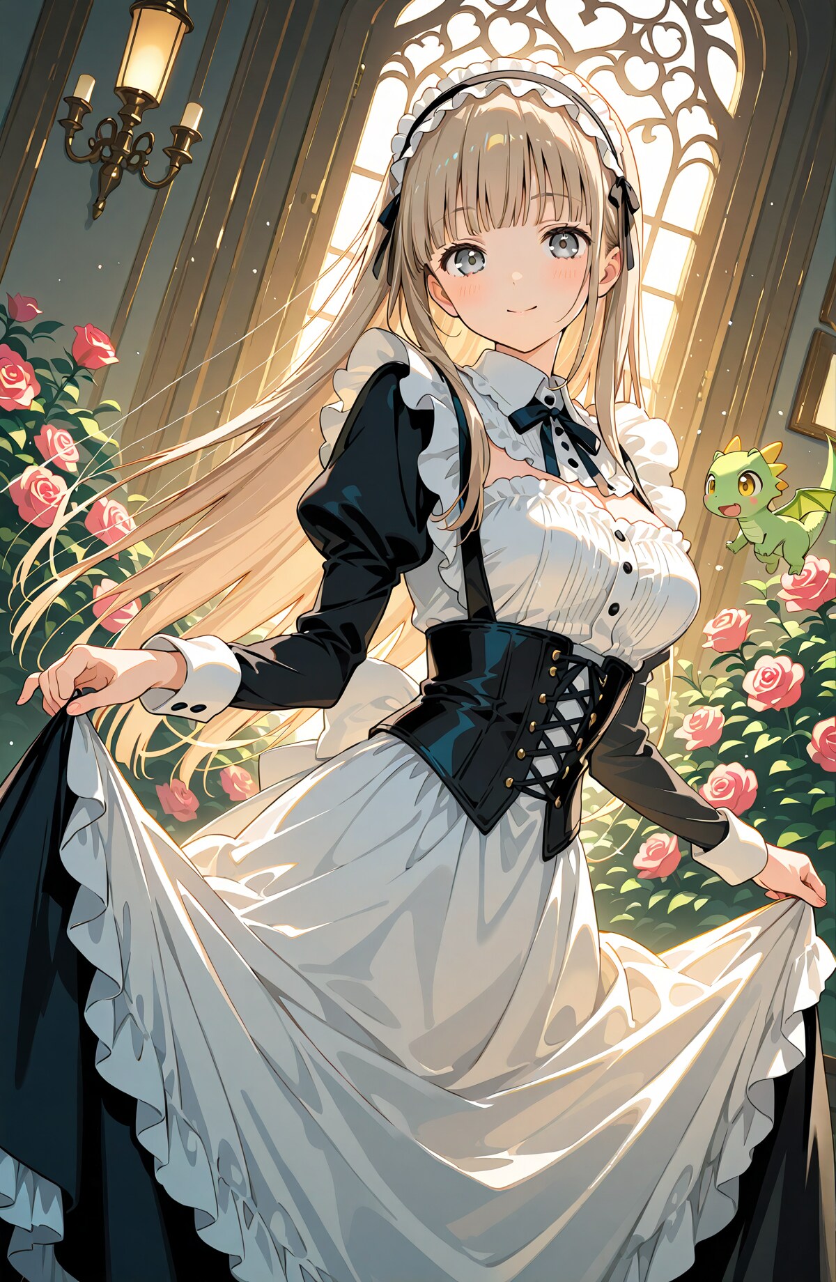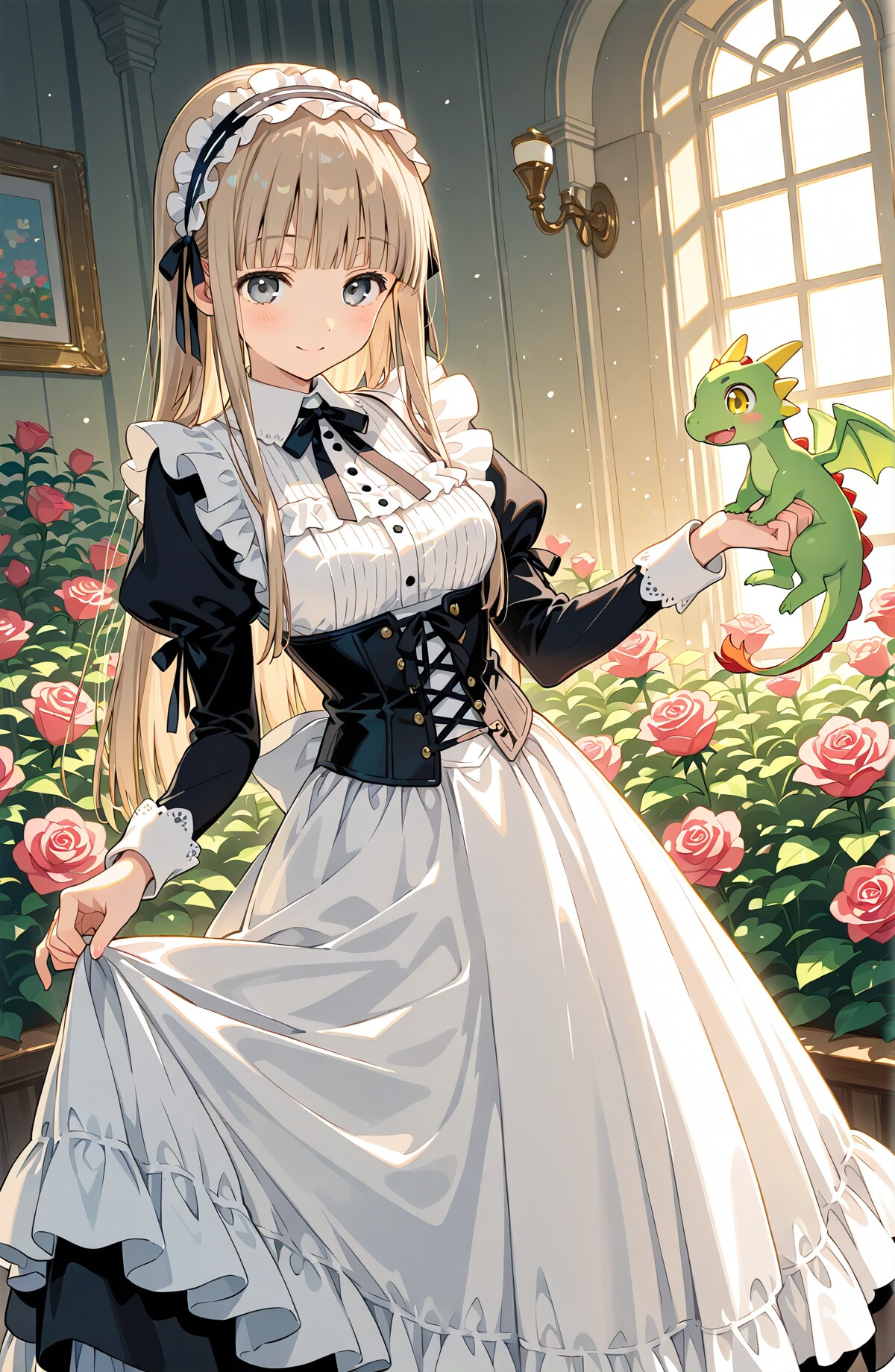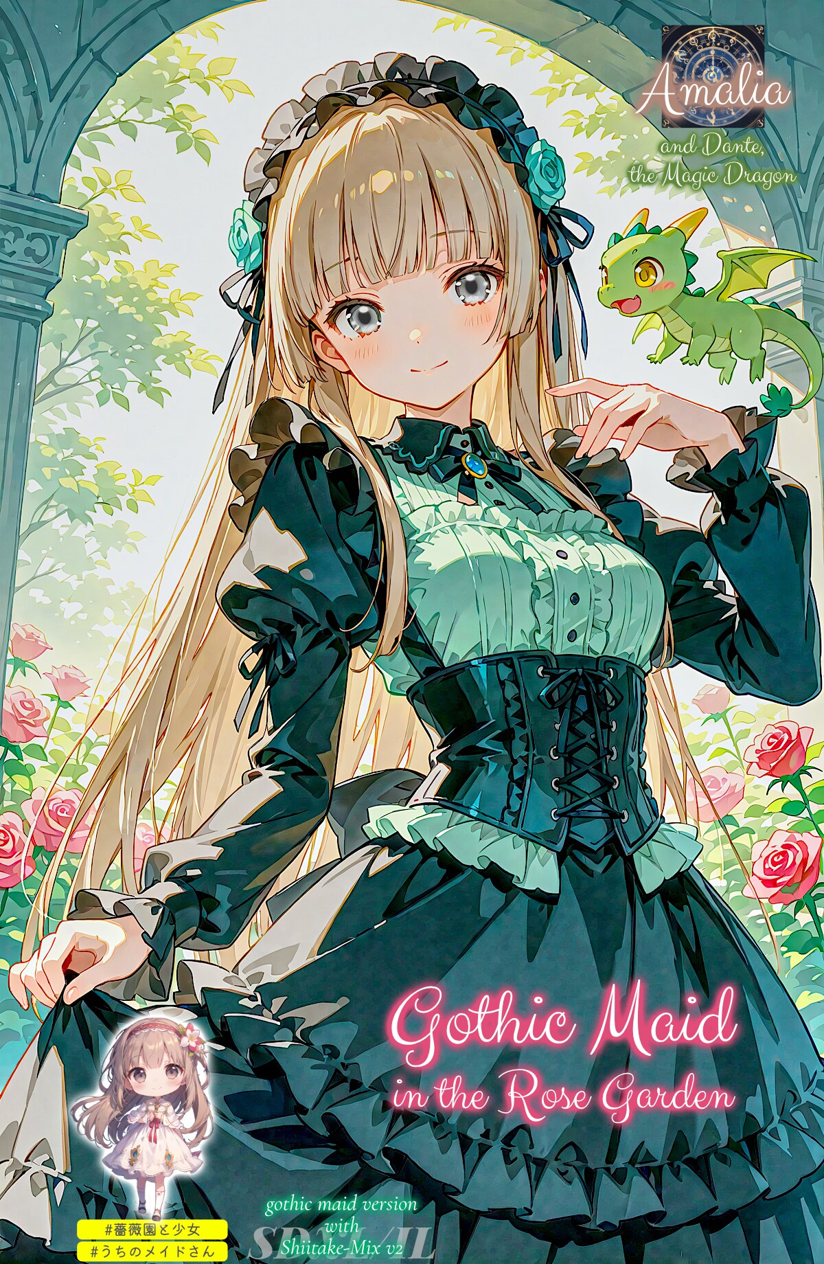 ・rose gardenを背景に指定して backlighting で後ろに光が当たるようにして、服装は gothic maid で指定しています。色彩で服装の黒の支配力が高かったので、やや明るめに補正して仕上げています。