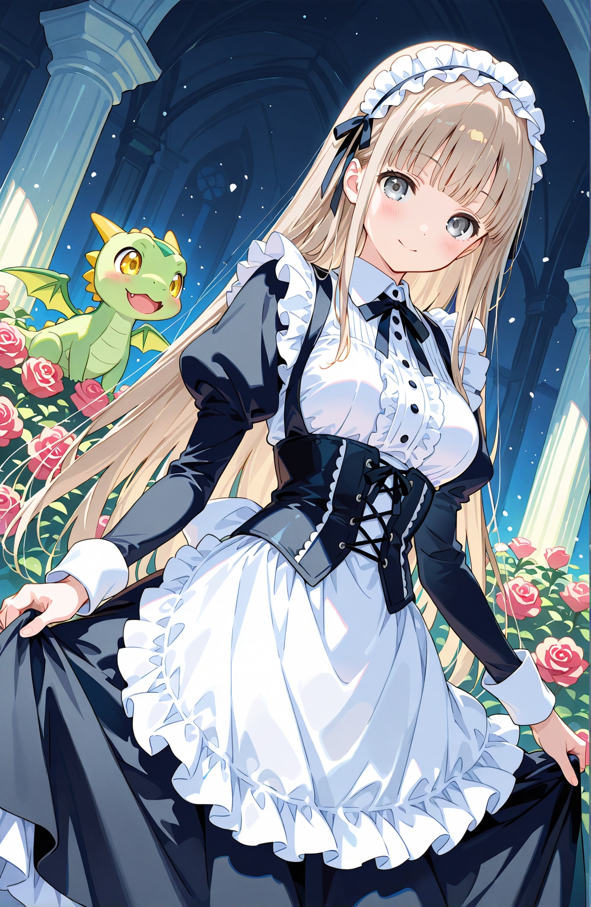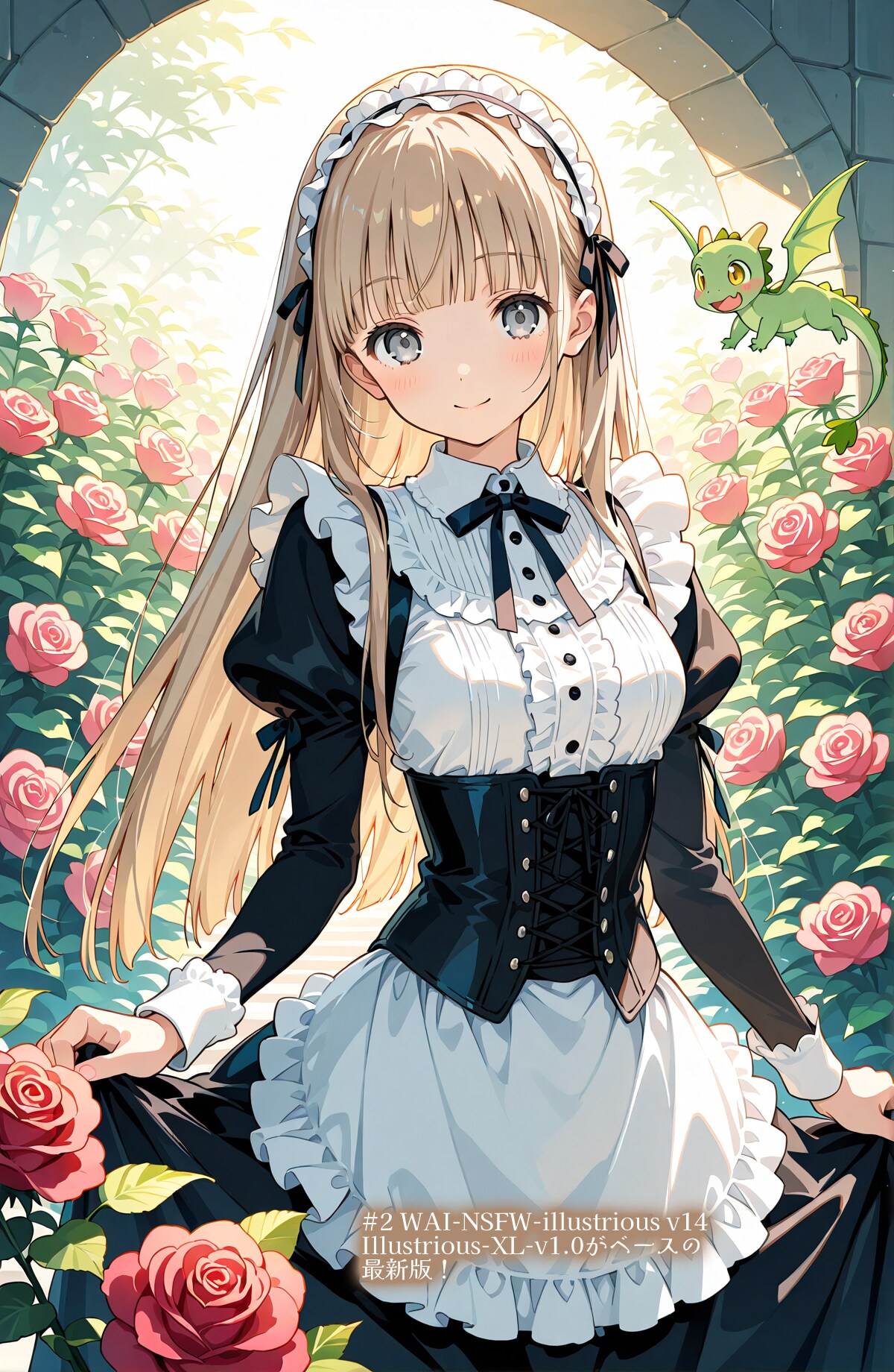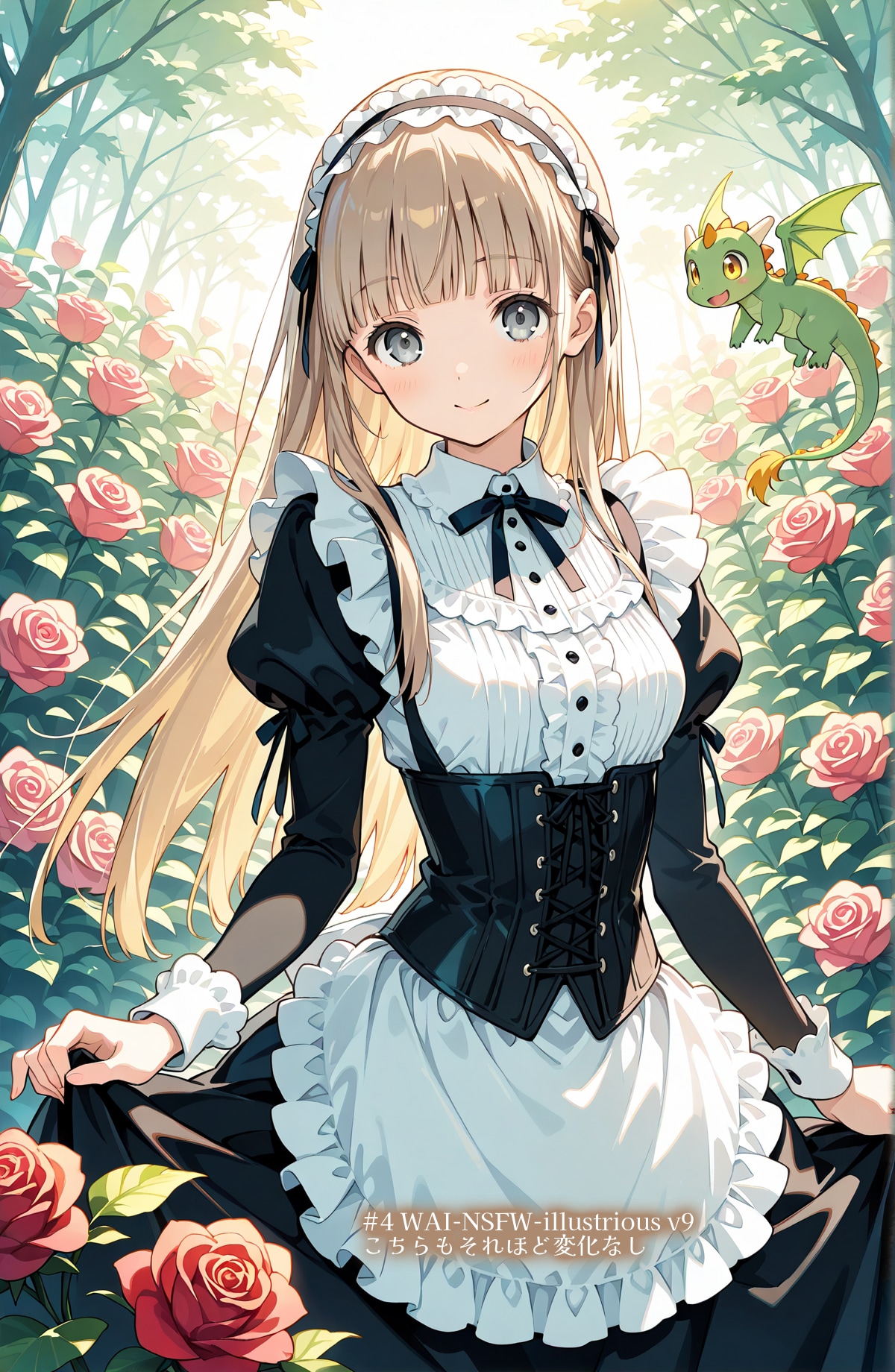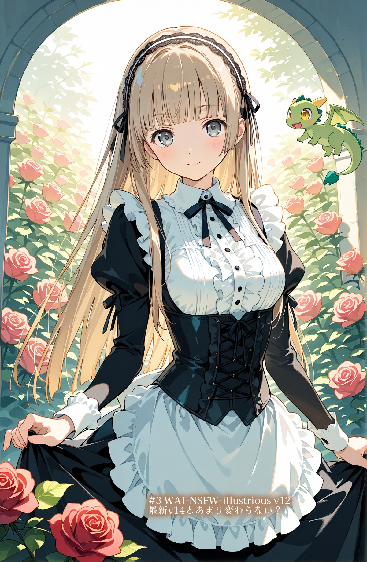 ・実は最初はWAI-NSFW-illustriousの最新版v14を試していてモデルを変えたら出たものです。懐かしのローゼンメイデンとかの世界観に登場できそうなゴシック(ゴスロリ?)メイドさんぽくなりました。「#薔薇園と少女」企画の「薔薇園に佇む少女」というテーマは、きっとこういうのが期待されているのでは...!と信じることにして、こちらをメイン作品にしました🌹
