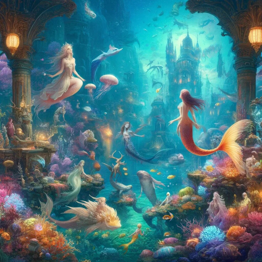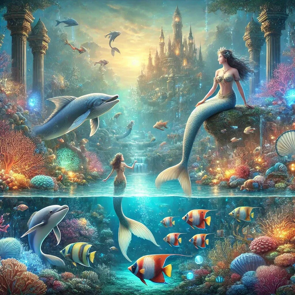 あなたは芸術家です。水の中のファンタジーの世界を描いてください、のように指示を出しました。