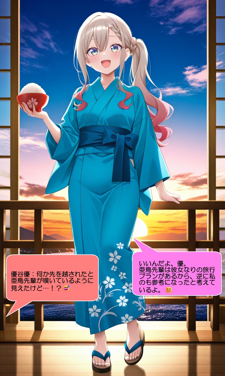 涼風涼:いいんだよ、優。亜鳥先輩は彼女なりの旅行プランがあるから、逆に私のも参考になったと考えているよ。😊