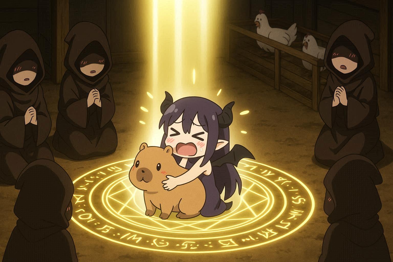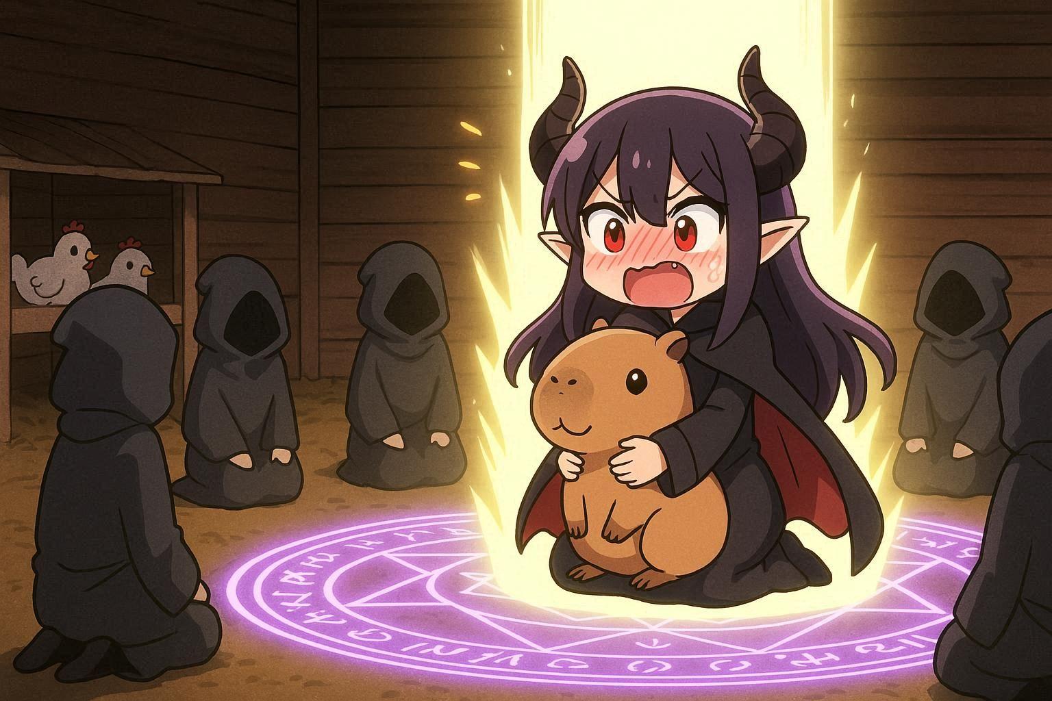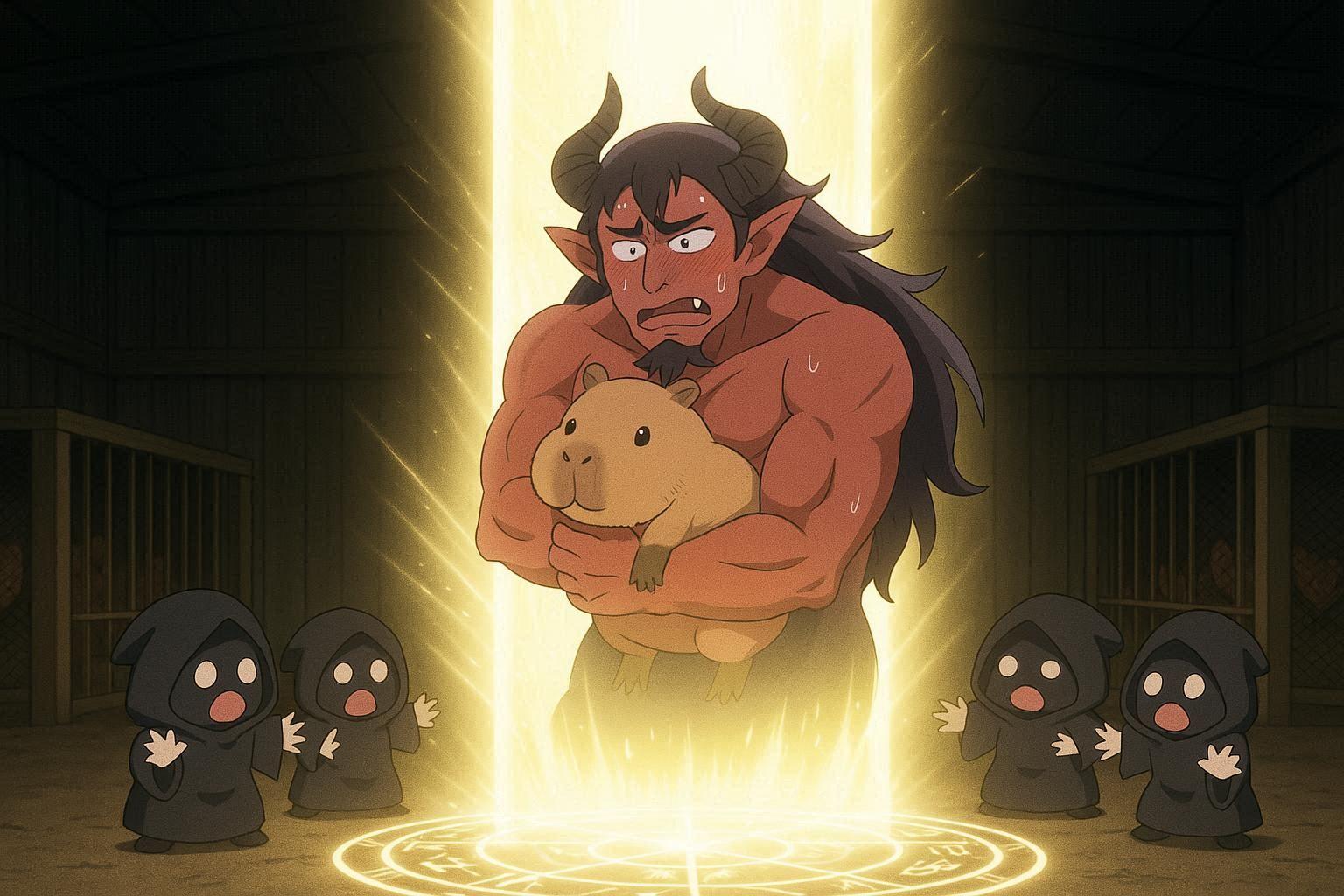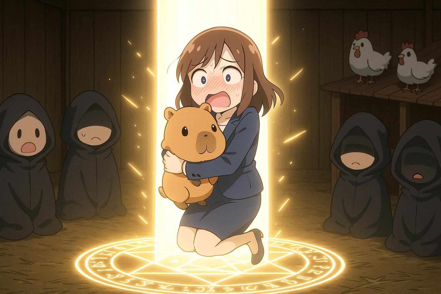 闇の呪術の儀式で魔法陣から宇宙で一番かわいいカピバラの召喚に挑むが光の柱からは宇宙で一番かわいいカピバラを抱きしめている◯◯が巻き添えで召喚される