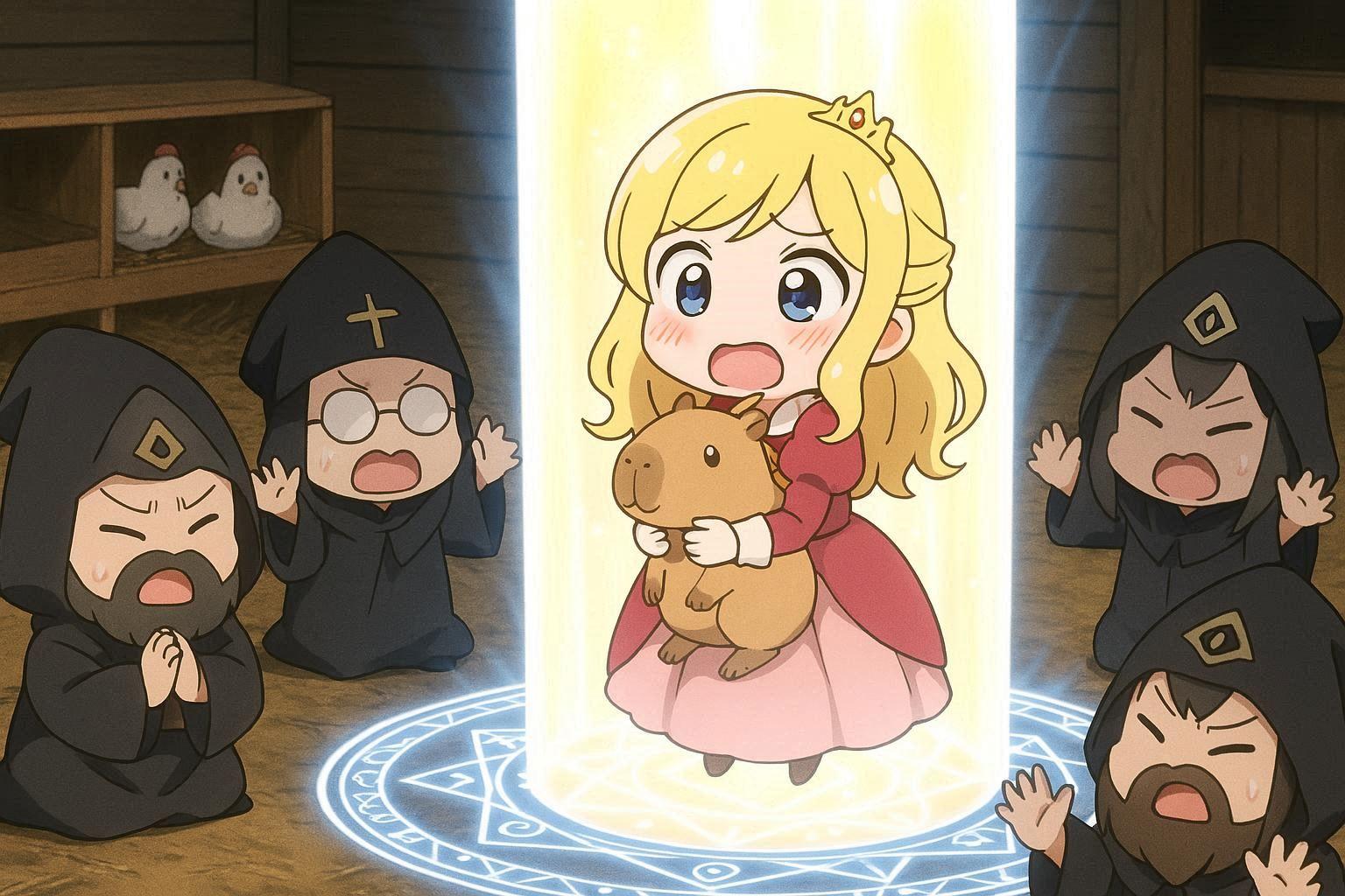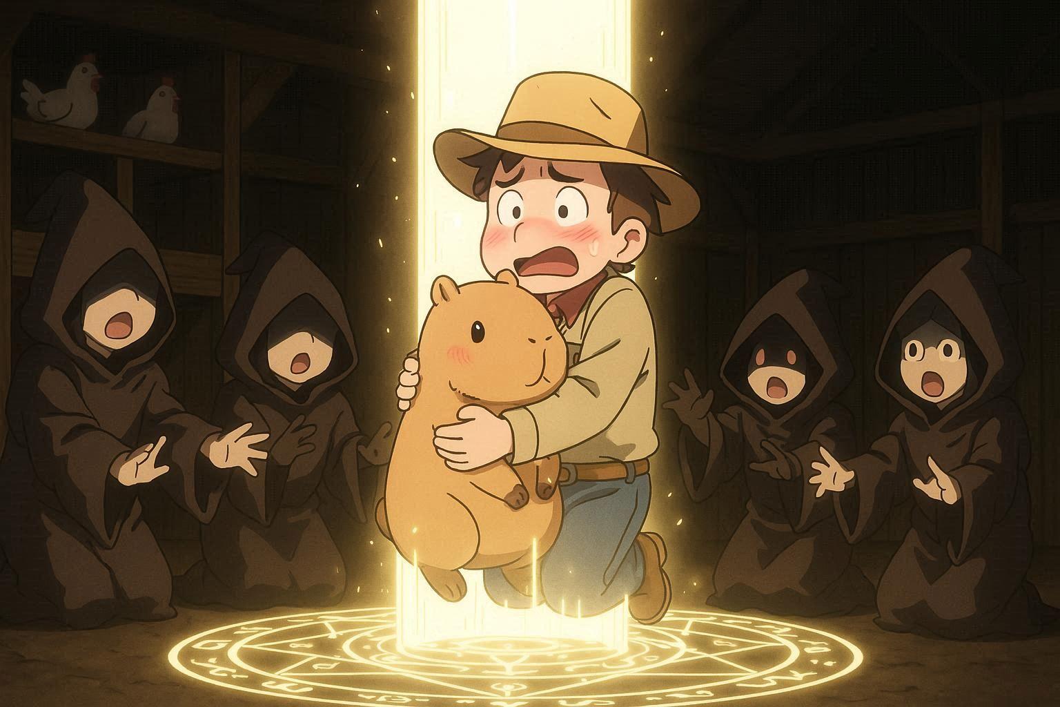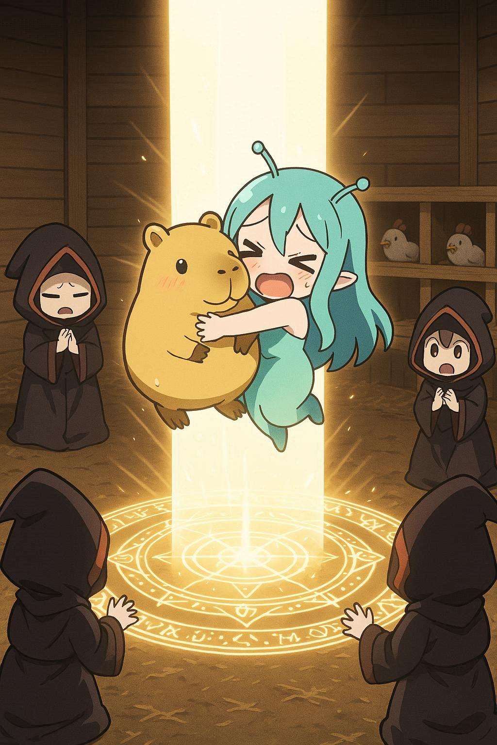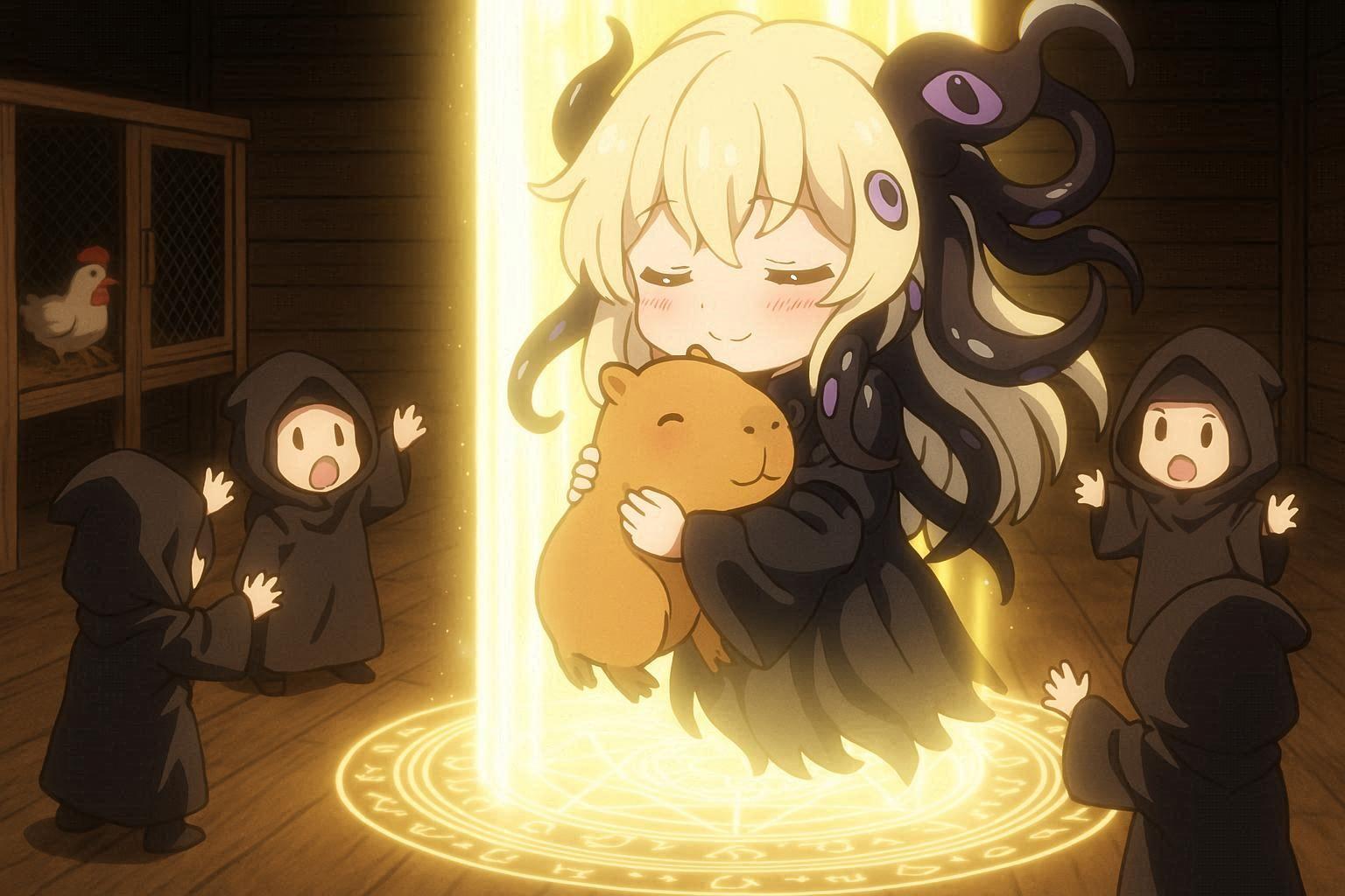 闇の呪術の儀式で魔法陣から宇宙で一番かわいいカピバラの召喚に挑むが光の柱からは宇宙で一番かわいいカピバラを抱きしめている◯◯が巻き添えで召喚される