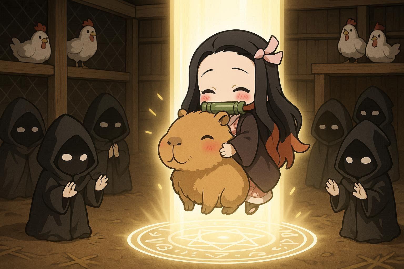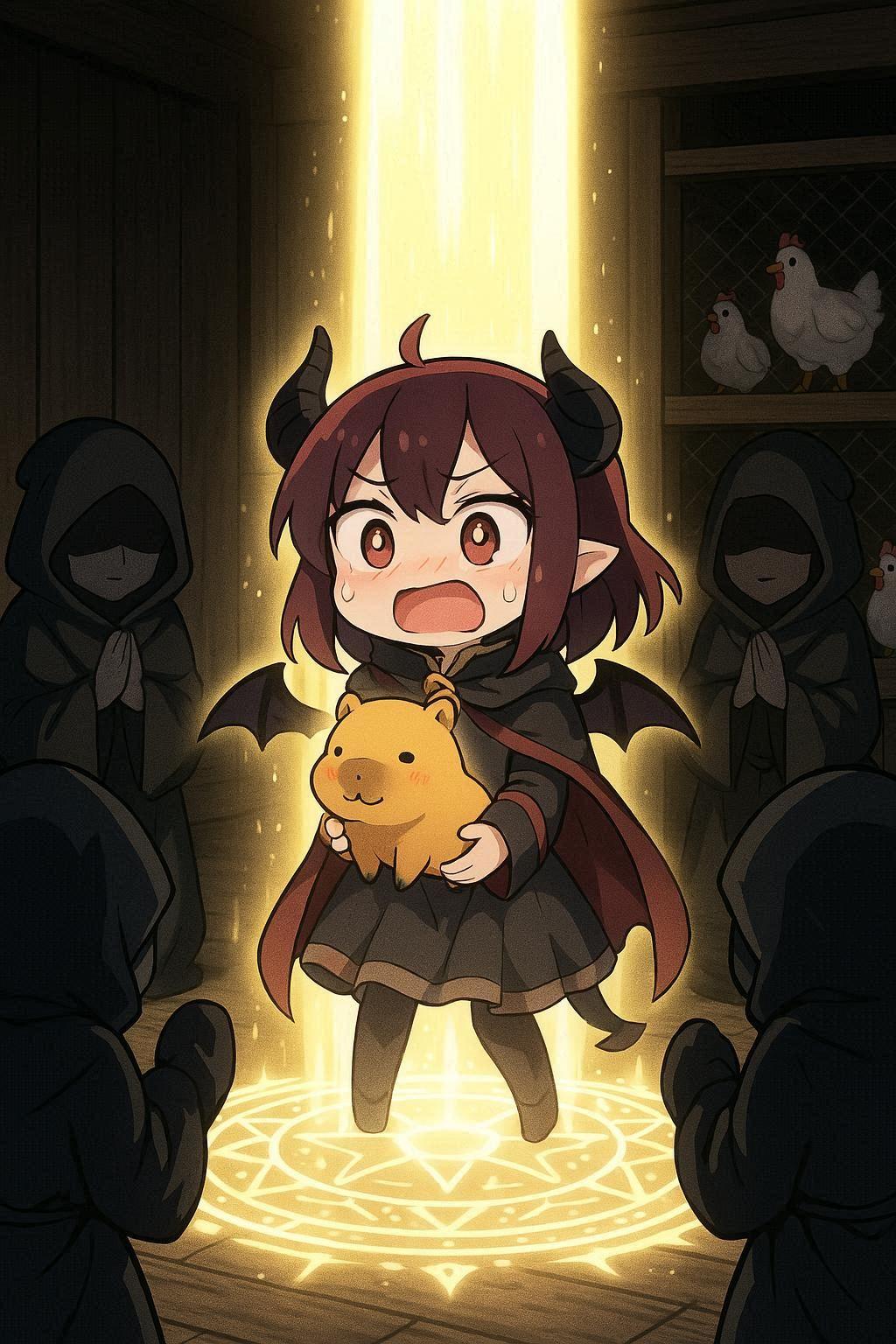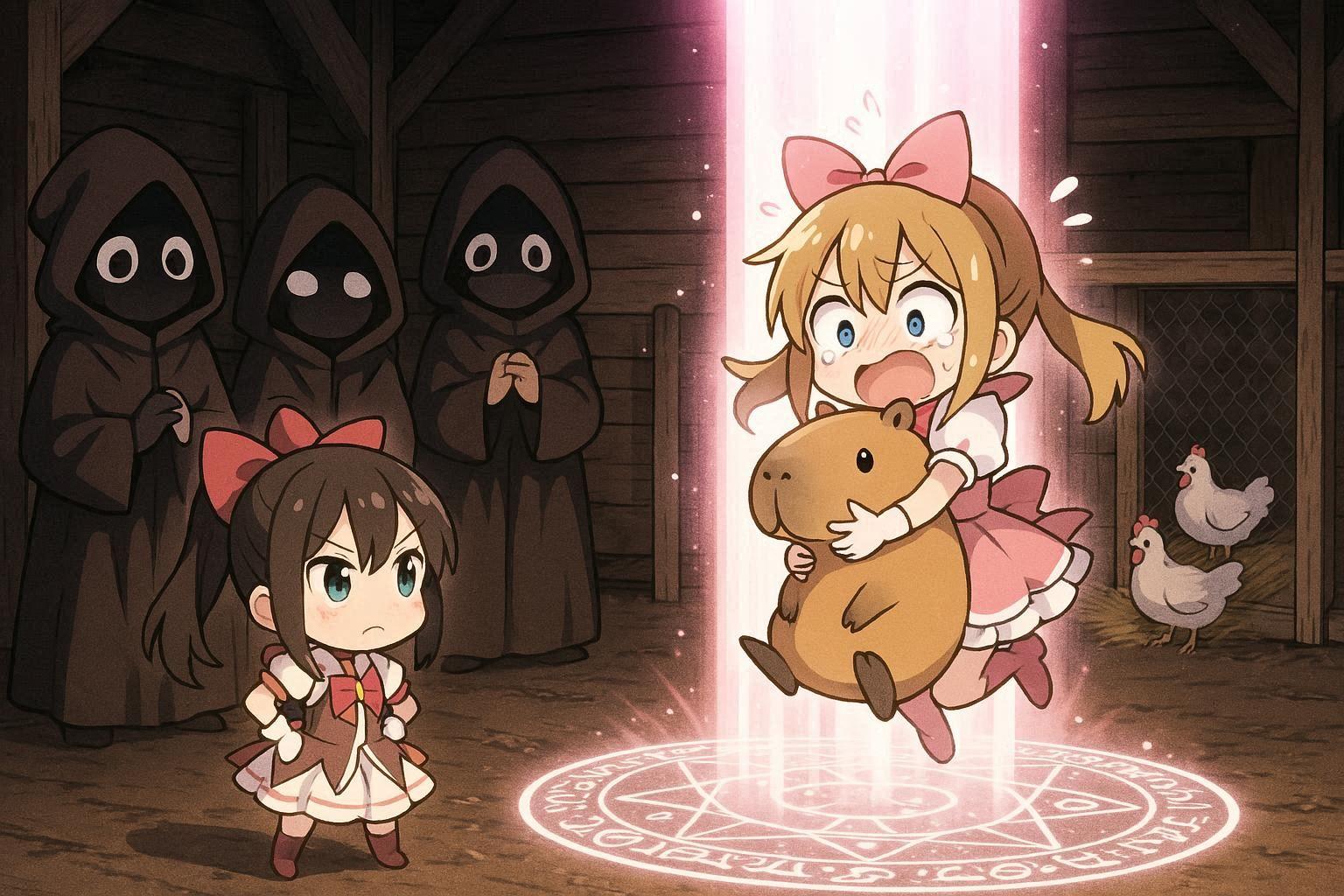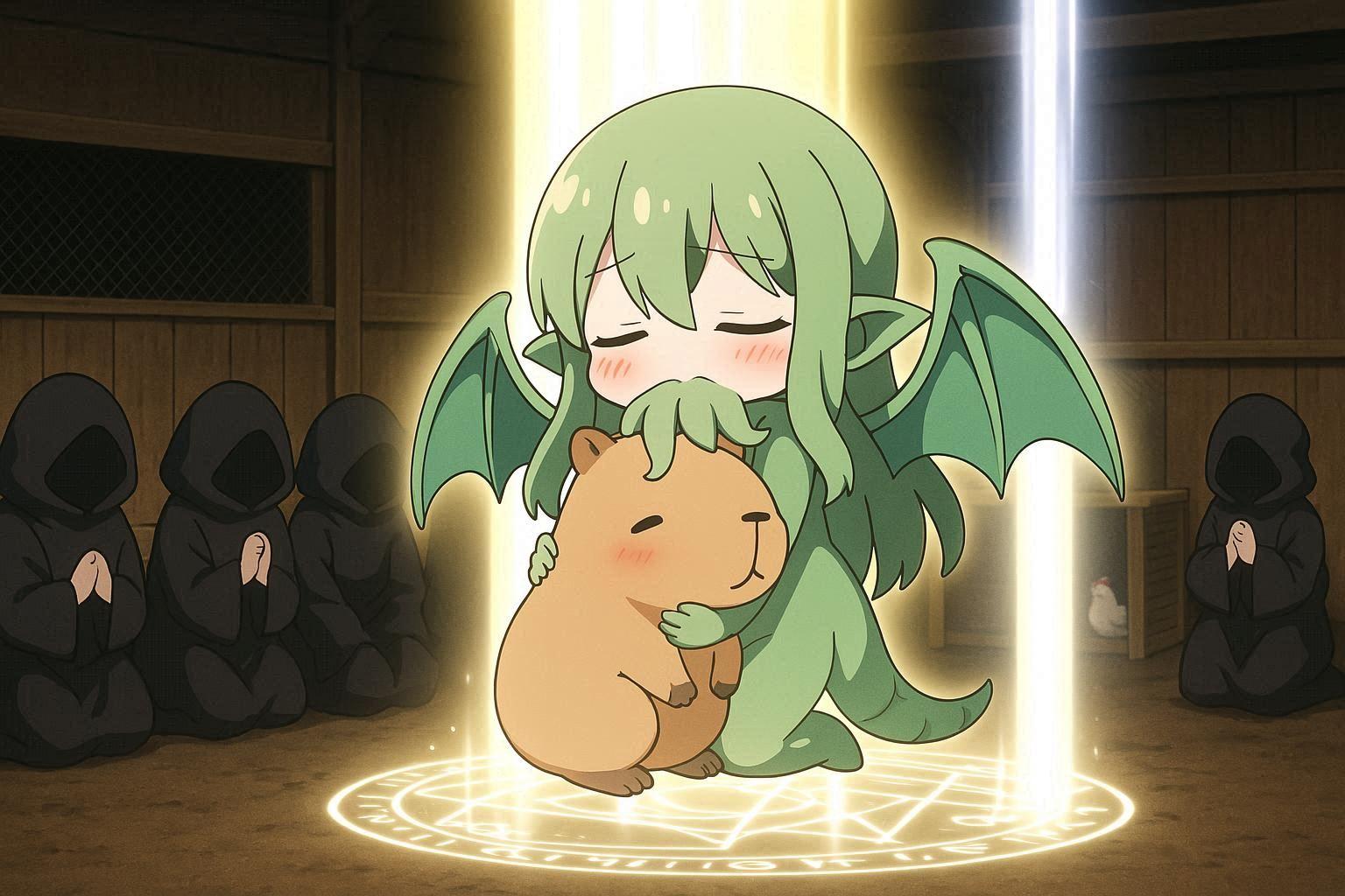 闇の呪術の儀式で魔法陣から宇宙で一番かわいいカピバラの召喚に挑むが光の柱からは宇宙で一番かわいいカピバラを抱きしめている◯◯が巻き添えで召喚される