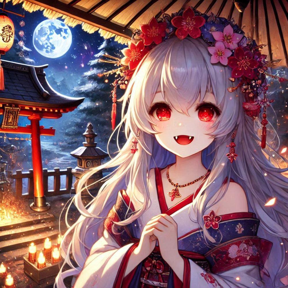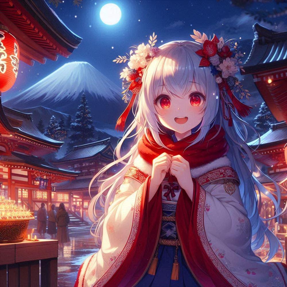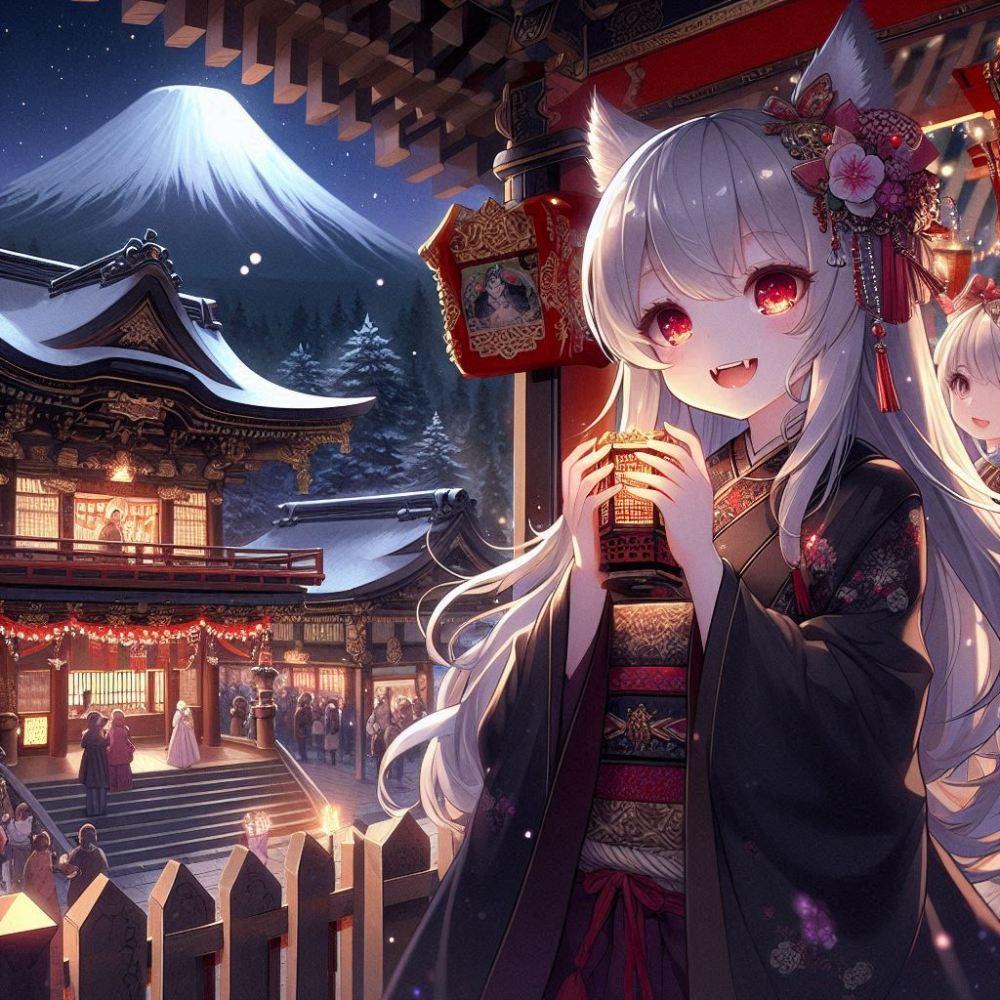 美少女ファンタジー、銀髪赤目の吸血鬼娘が振袖姿で夜の神社を参拝する正月