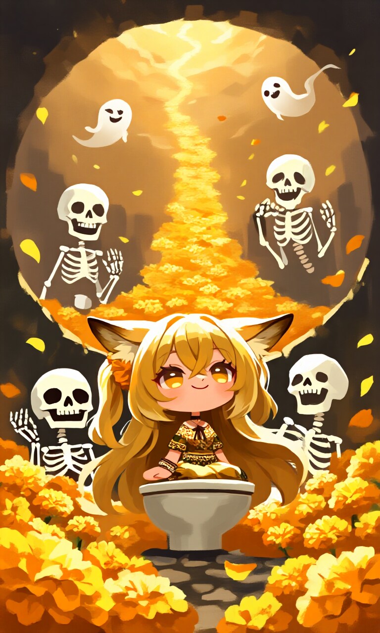 死者の日スペシャル!あの世の花道のど真ん中、狐娘がトイレで満面の笑み…スケルトンたちも思わずニッコリ!?