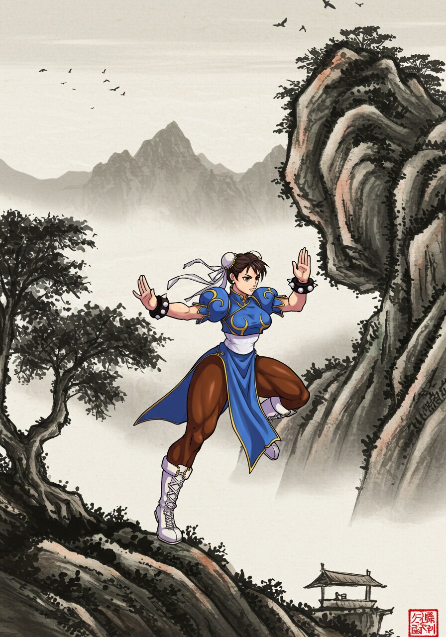 山水画の中に春麗♪・・(水墨山水画とイラストの融合)