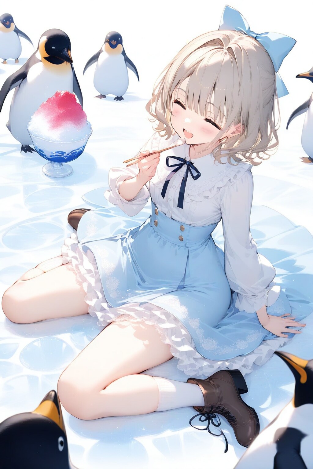 ペンギンたちとデザートのかき氷で快適な日向ちゃん