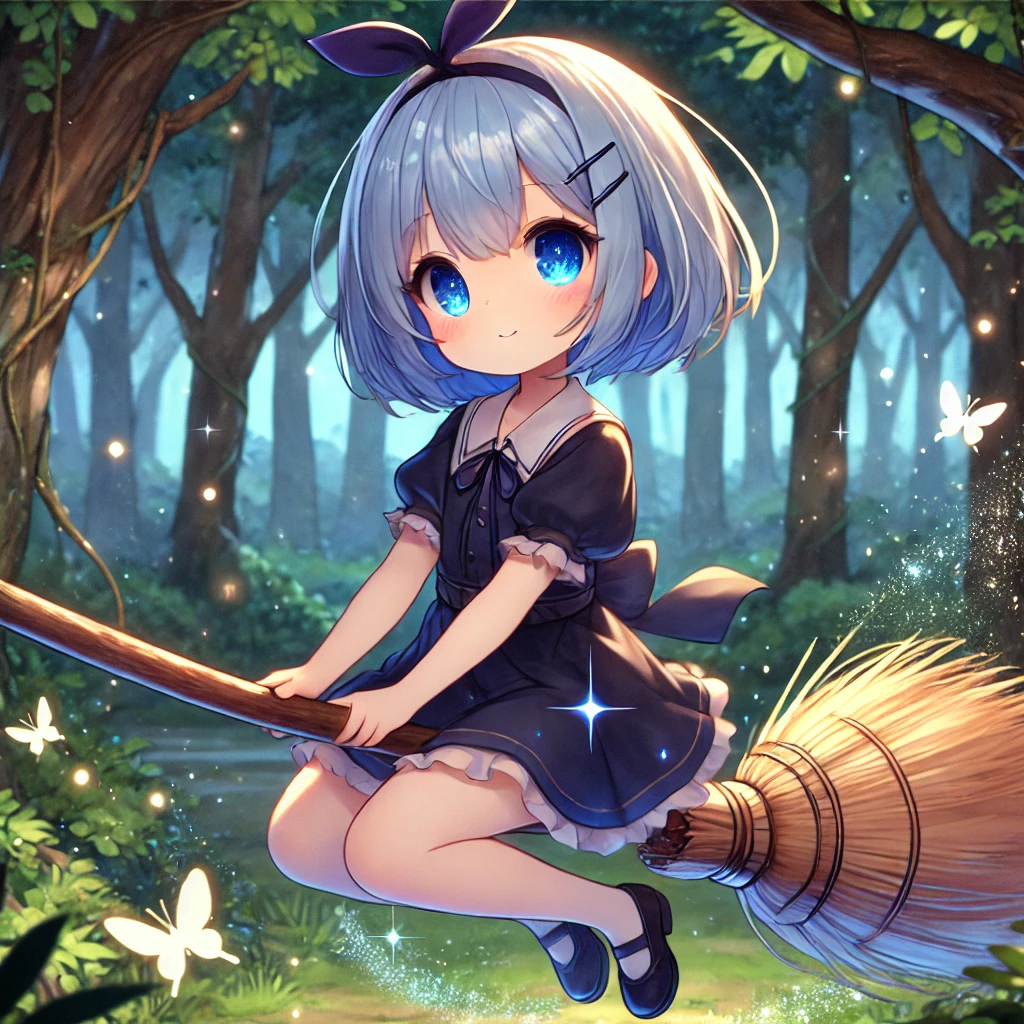 夜の森の奥で、光の精霊たちが舞う中、ボブ子ちゃんは静かに箒を止めた。葉の間から差す月光が彼女の髪を青白く照らす。魔法使いとしての運命を感じた、ひとときの静寂。
