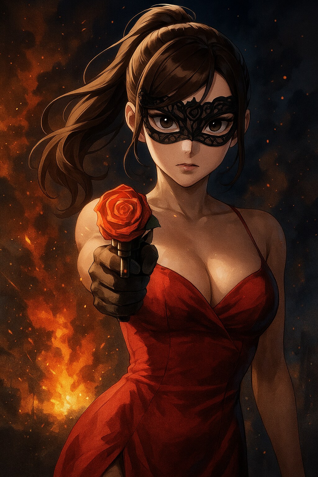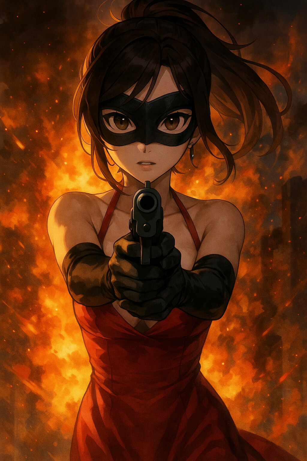 「爆炎を背負いながらも揺るがぬ視線。ヒロインの存在感は炎をも凌ぐ。