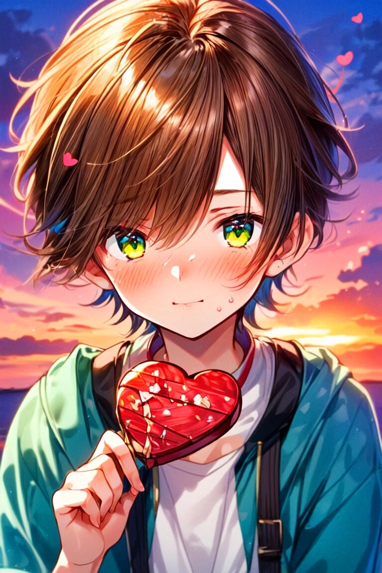 バレンタインデーの、ブラウン髪の少年も生成してみました。ブラウン髪の少年では他の二人のぶん、照れさせたい…!と思い、他の二人以上に照れさせてみました。結果、とてもかわいい照れ顔が見れてよかったです~。夕焼け効果もいい感じです。こんなふうに受け取ってくれたら、とても嬉しいですね。