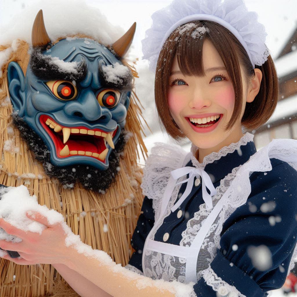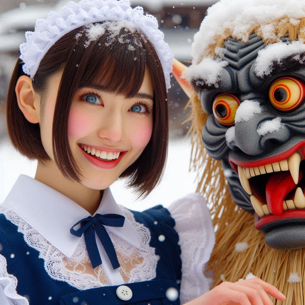 クールなメイド3号も初めて見るナマハゲと雪だらけの景色に思わずはしゃいでしまいました。